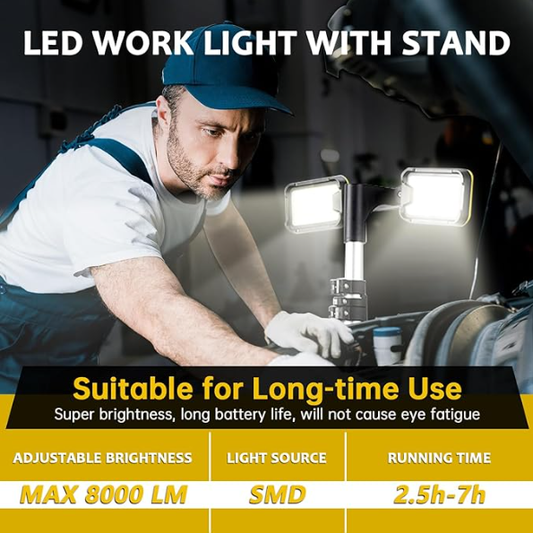 8000 Lumen Rechargeable LED Work Light with Stand, Portable Cordless Work Light with 2 Powerful Adjustable LED Lamps, Waterproof Tripod Worklights for Outdoor Indoor Job Site Workshop Garage