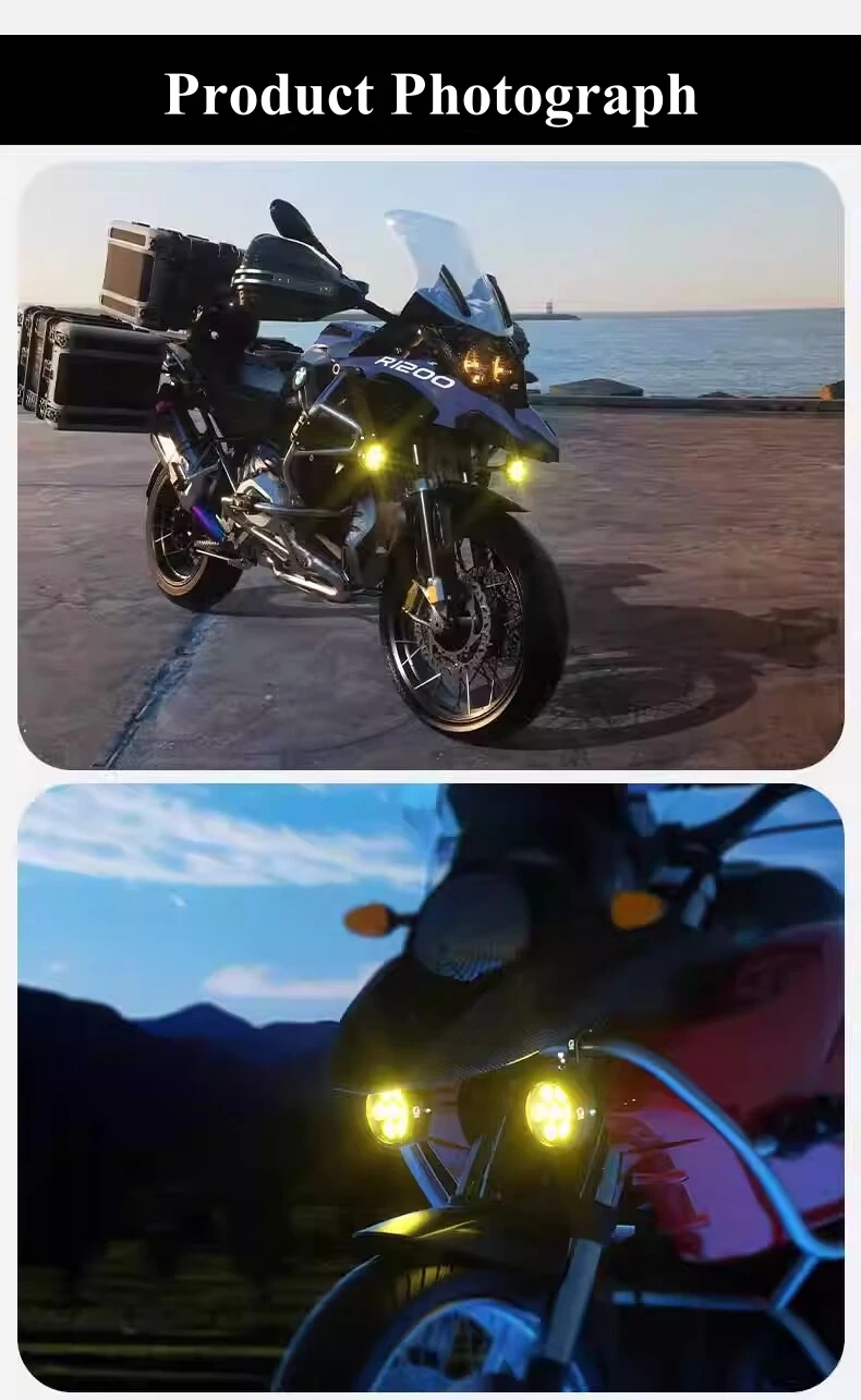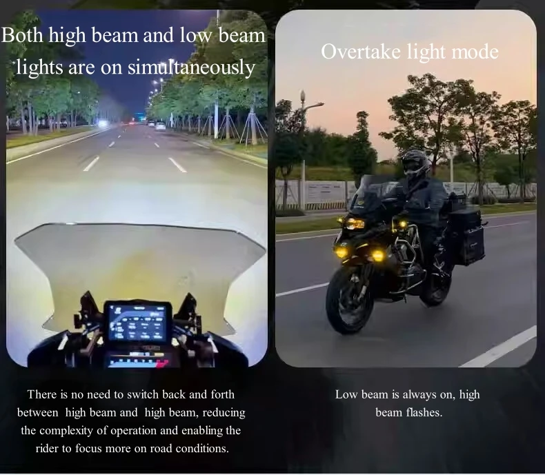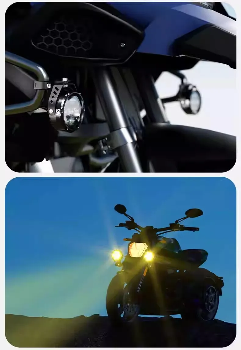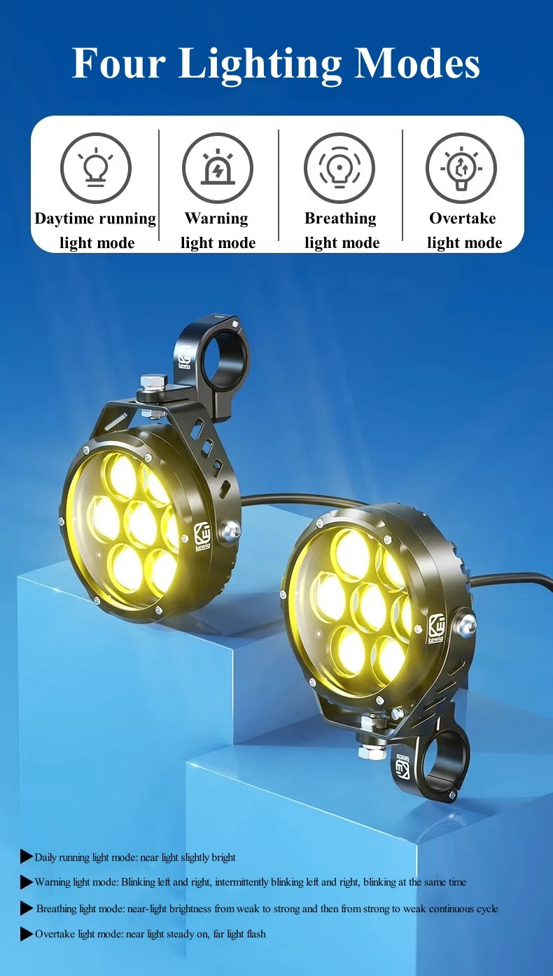 Our motorcycle auxiliary light with 6.7ft waterproof harness kit. The light mode can be freely switched on and off with the switch: white/amber/amber+white (mixed light), warning light mode: left and right time-sharing strobe/left and right alternating strobe/left and right simultaneous strobe - the different light modes can be adapted to the different weather conditions encountered during the ride.