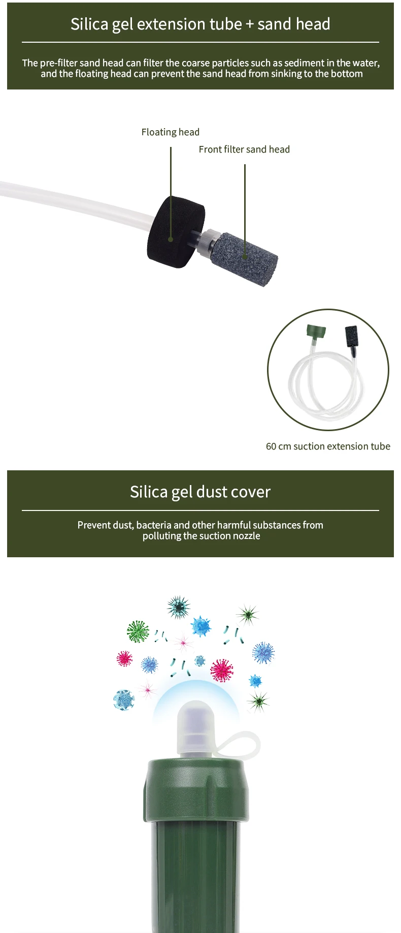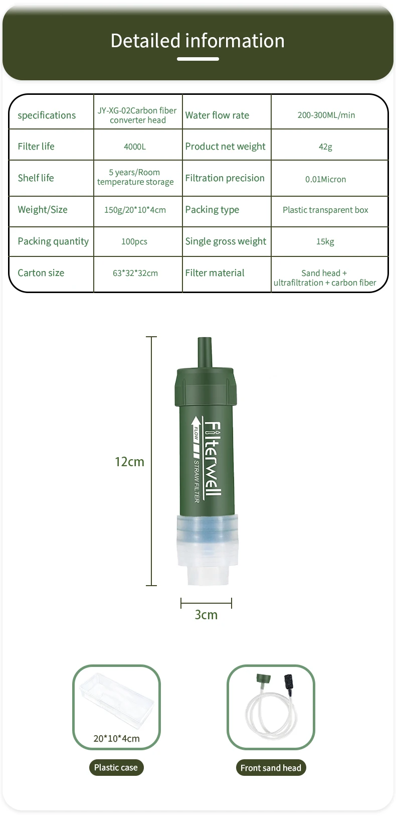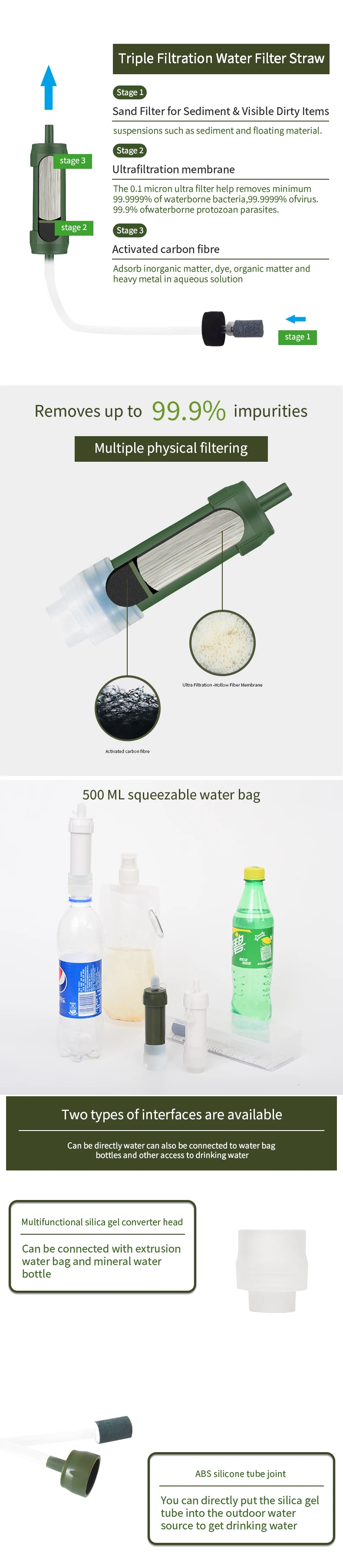 water filter straw. This portable and light weight water straw is ideal for backpacking, hiking, camping, scouting,back country travel, mission trip and emergency preparedness. Hollow fiber UF membrane carbon fiber combination .can remove 99.9999%, such as salmonella, cholera, E.coli, and protozoa, such as giardia, cryptosporidium, and sediment, odor, color, chlorine, organic matter and heavy metal.