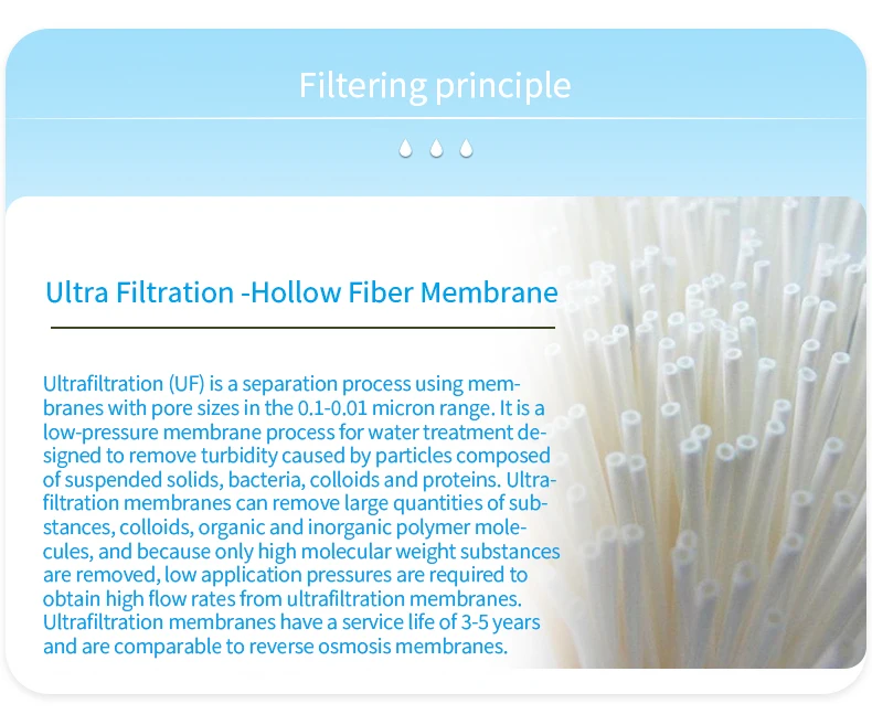 molecules, beneficial minerals and trace elements in the water to pass through, and the smallest bacteria have a volume above 0.02 microns . Therefore, bacteria, as well as colloids, rust, suspended solids, sediments, and macro molecular organics that are much larger than bacteria can be intercepted by the ultra filtration membrane, thereby realizing the purification process.銆�