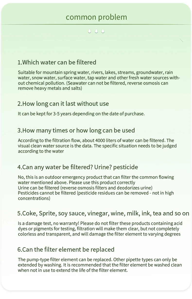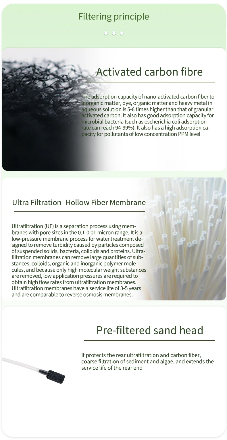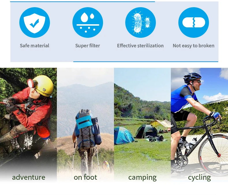 back country travel, mission trip and emergency preparedness. Hollow fiber UF membrane carbon fiber combination .can remove 99.9999% such as salmonella, cholera, E.coli, and protozoa, such as giardia, cryptosporidium, and sediment, odor, color, chlorine, organic matter and heavy metal.