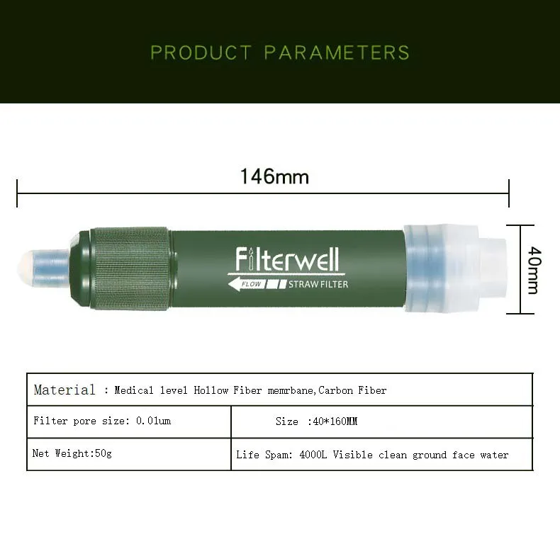 Filterwell 2 in 1 case Outdoor Emergency Portable Personal Water Filtration Filter Straw Purifier Survival Gear