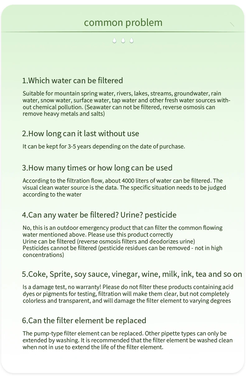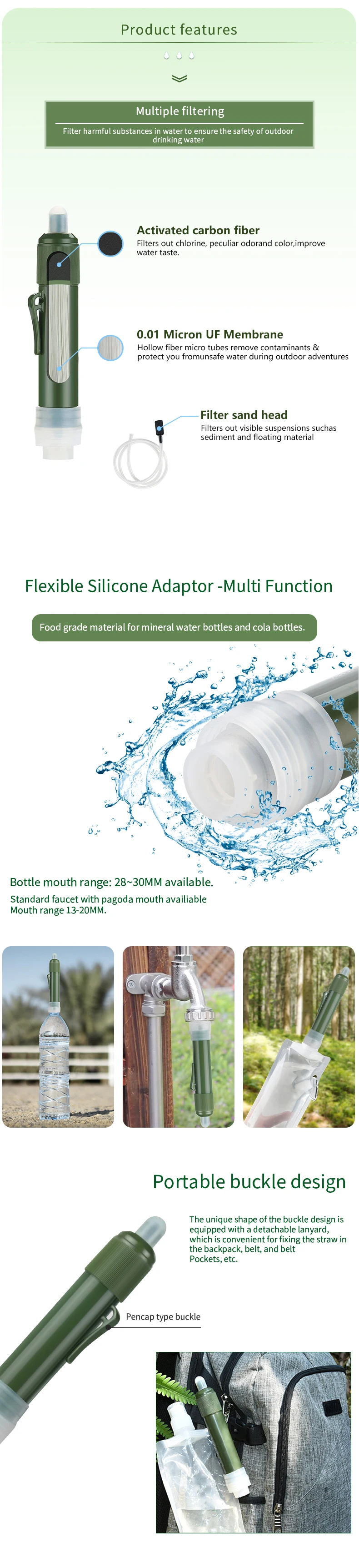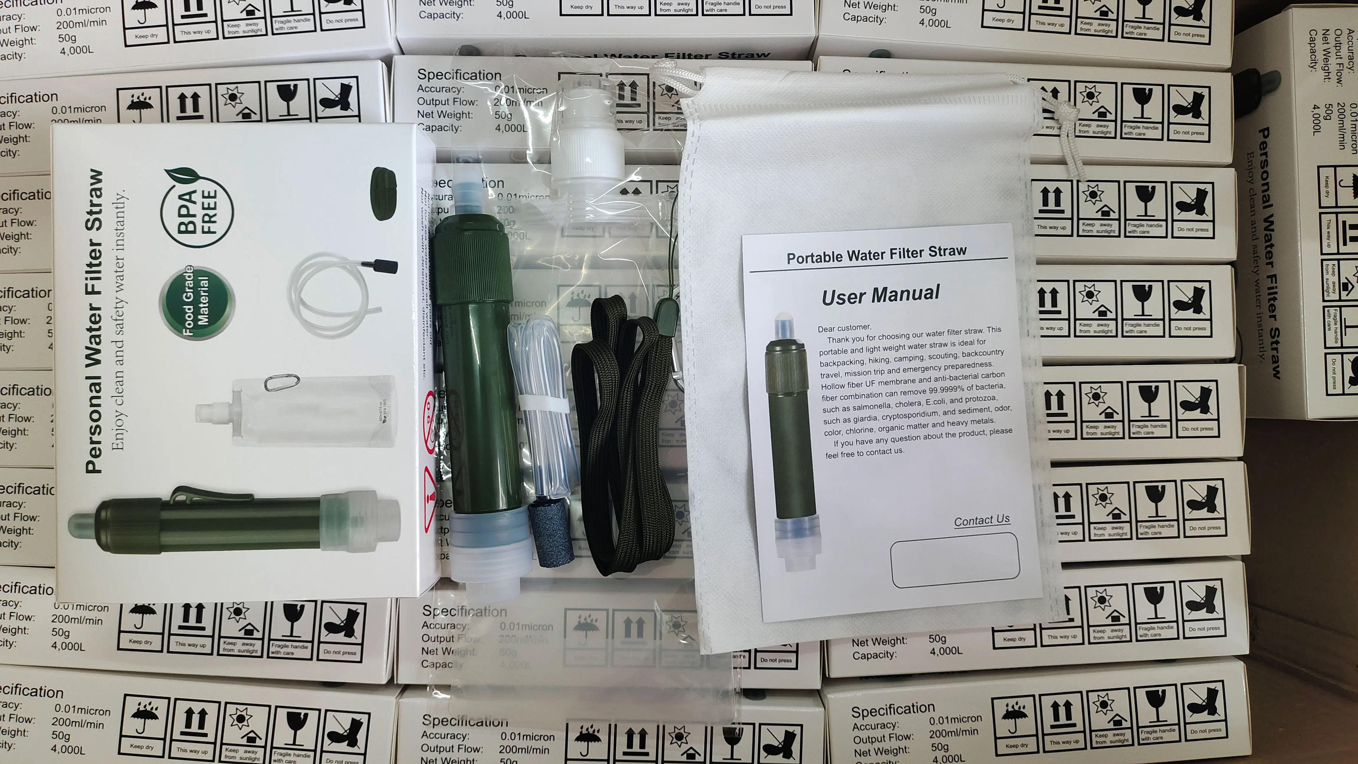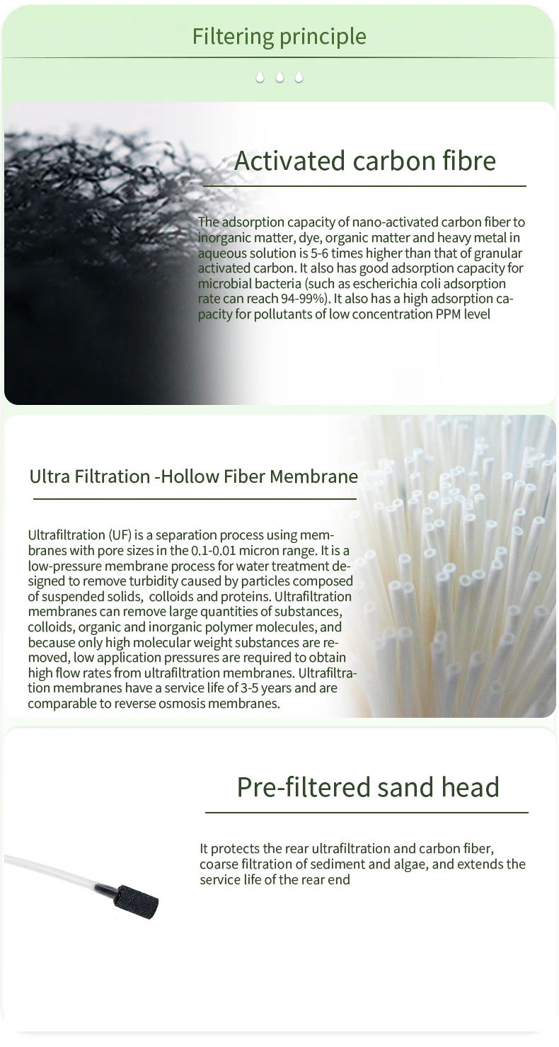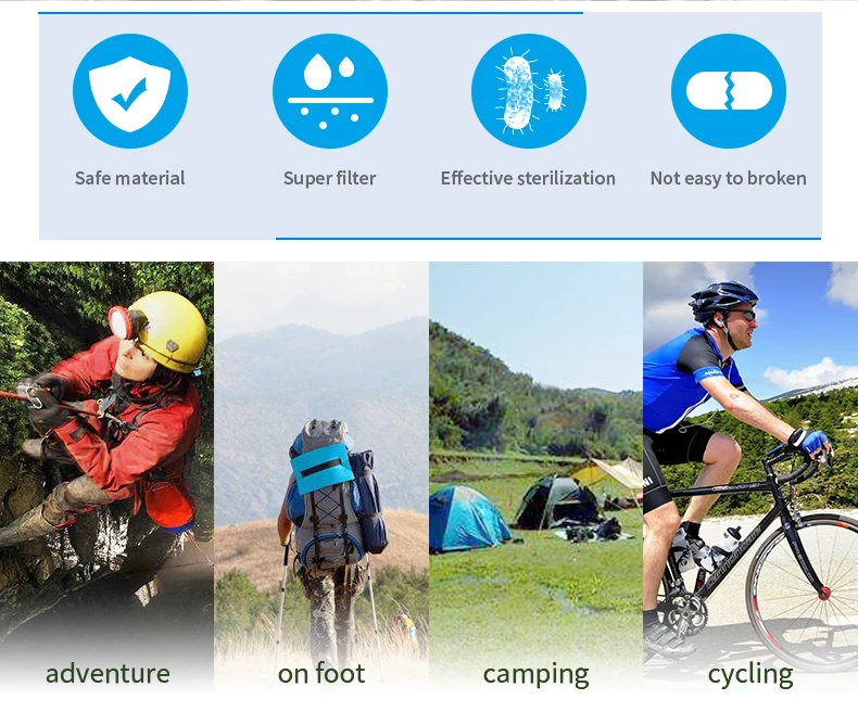 back country travel, mission trip and emergency preparedness. Hollow fiber UF membrane and anti-bacterial carbon fiber combination .can remove 99.9999% of bacteria, such as salmonella, cholera, E.coli, and protozoa, such as giardia, cryptosporidium, and sediment, odor, color, chlorine, organic matter and heavy metal.
