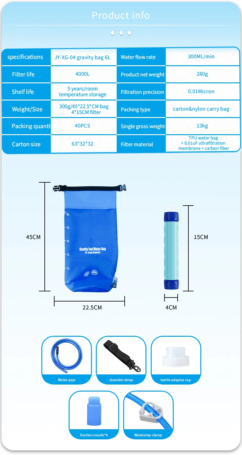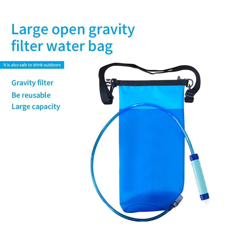 A gravity water filter bag is a portable water purification device designed to provide clean and safe drinking water using the