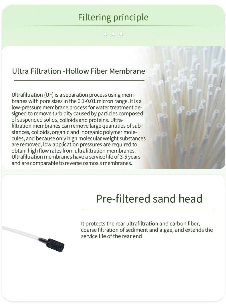 back country travel, mission trip and emergency preparedness. Hollow fiber UF membrane and anti-bacterial carbon fiber combination