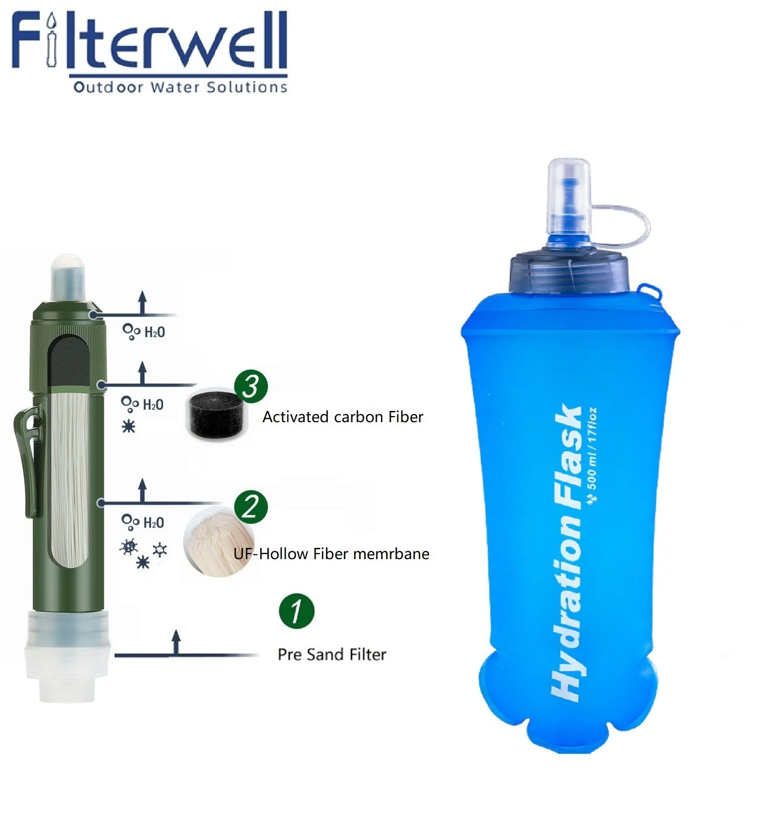 Filterwell Collapsible Running Soft Bottle Outdoor Squeezable Pouch with Water Filtration Filter Straw Hydration Flask