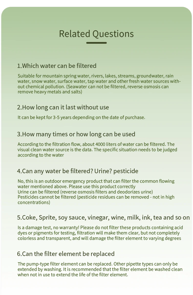 * FAST FLOW RATE: 1500 ML PER mins , Can be used directly from fresh water source, pumped into Empty water bottle, OR pumped into any portable hydration pack. Perfect for backpacking gear for outdoor activities , hiking, camping, scouting, back country travel and emergency preparedness.