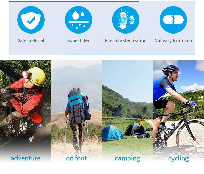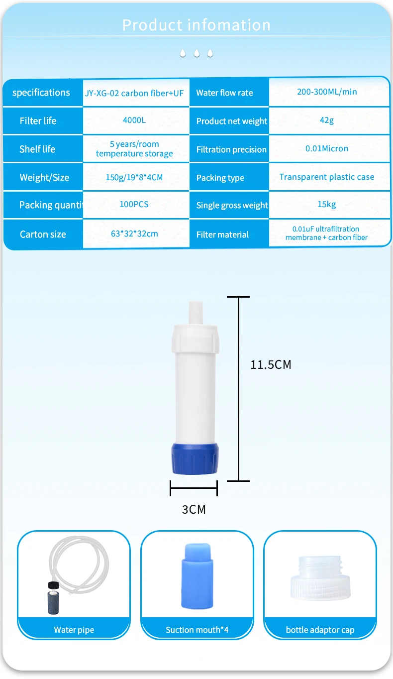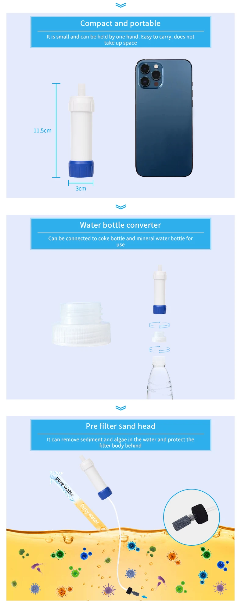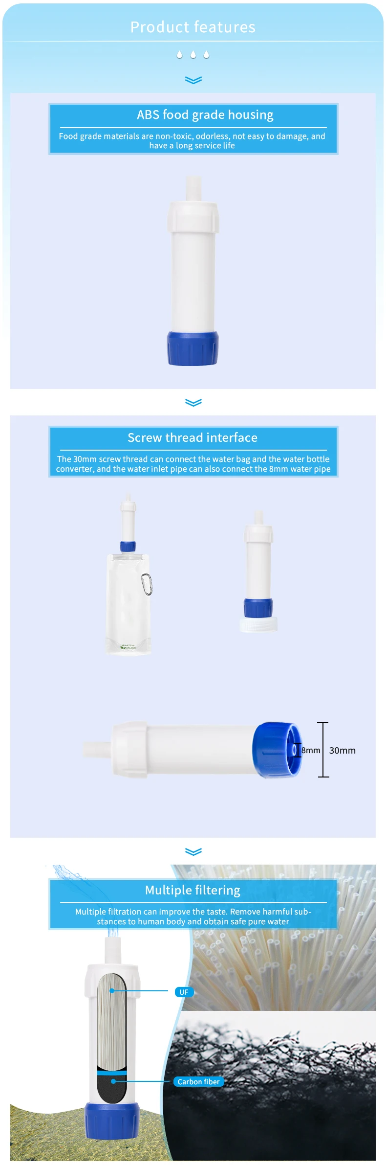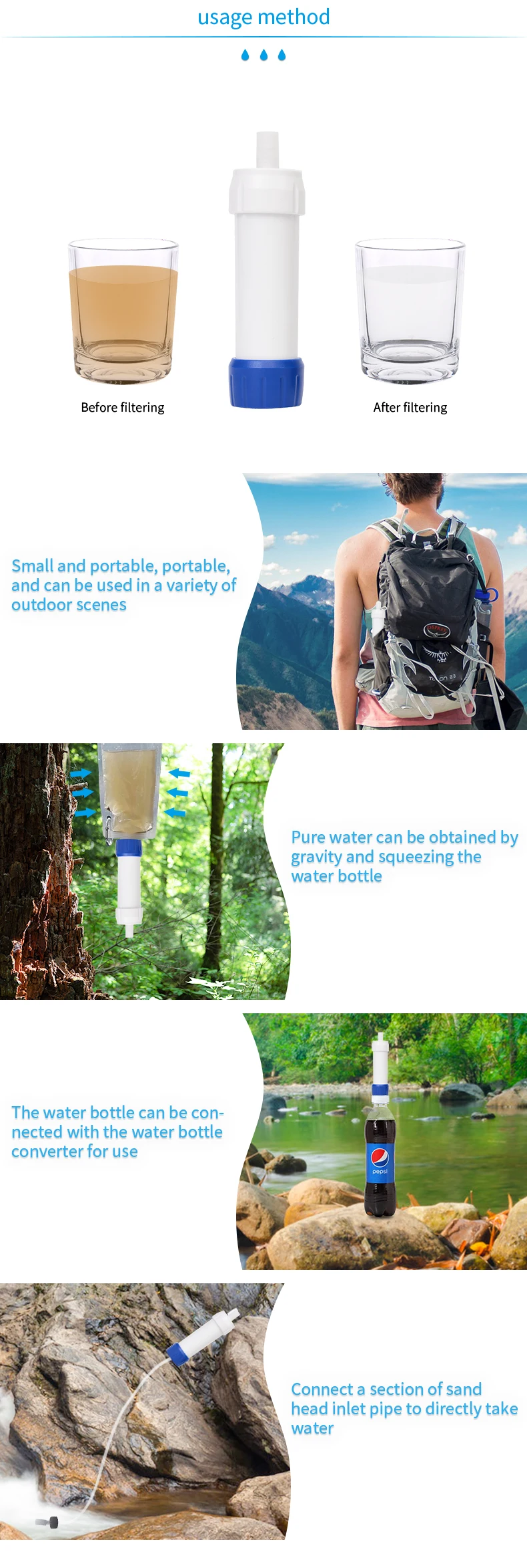 water filter straw. This portable and light weight water straw is ideal for backpacking, hiking, camping, scouting,back country travel, mission trip and emergency preparedness. Hollow fiber UF membrane carbon fiber combination .can remove 99.9999% , such as salmonella, cholera, E.coli, and protozoa, such as giardia, cryptosporidium, and sediment, odor, color, chlorine, organic matter and heavy metal.