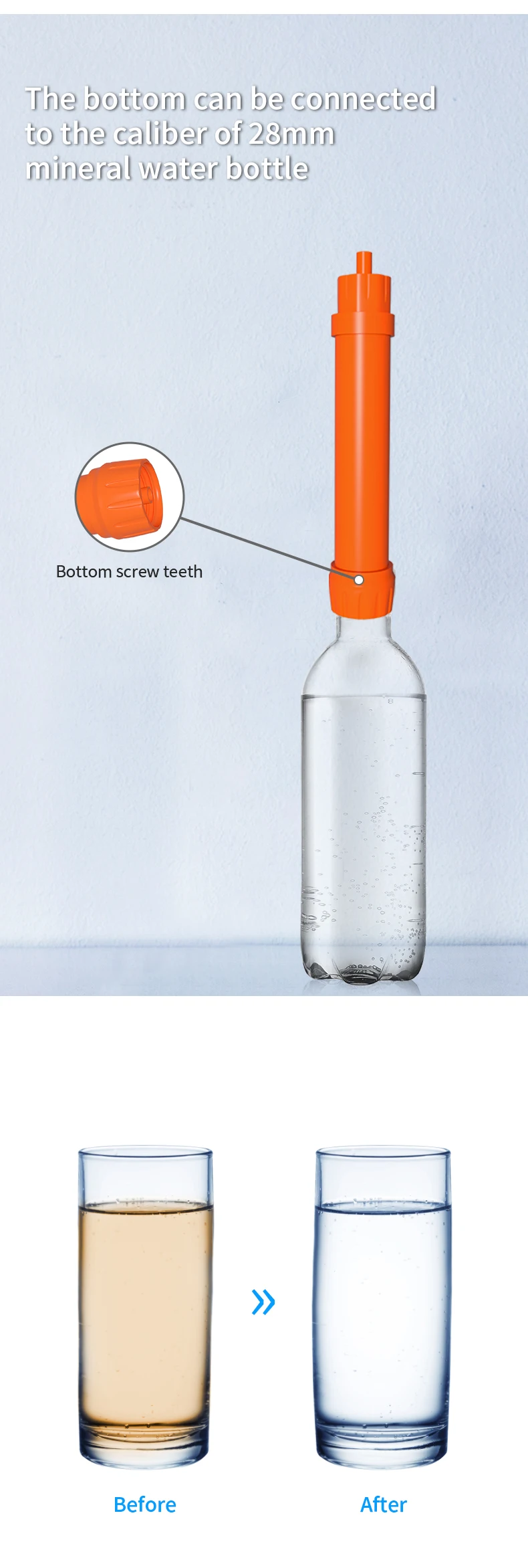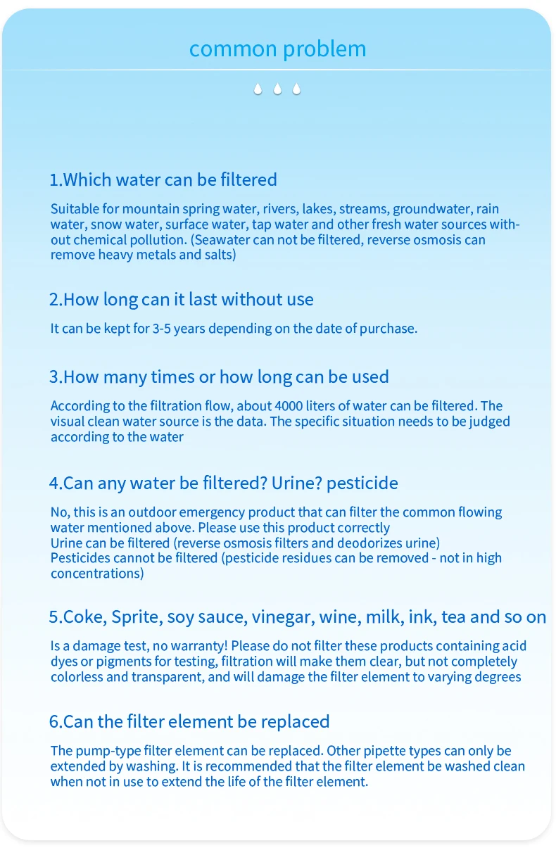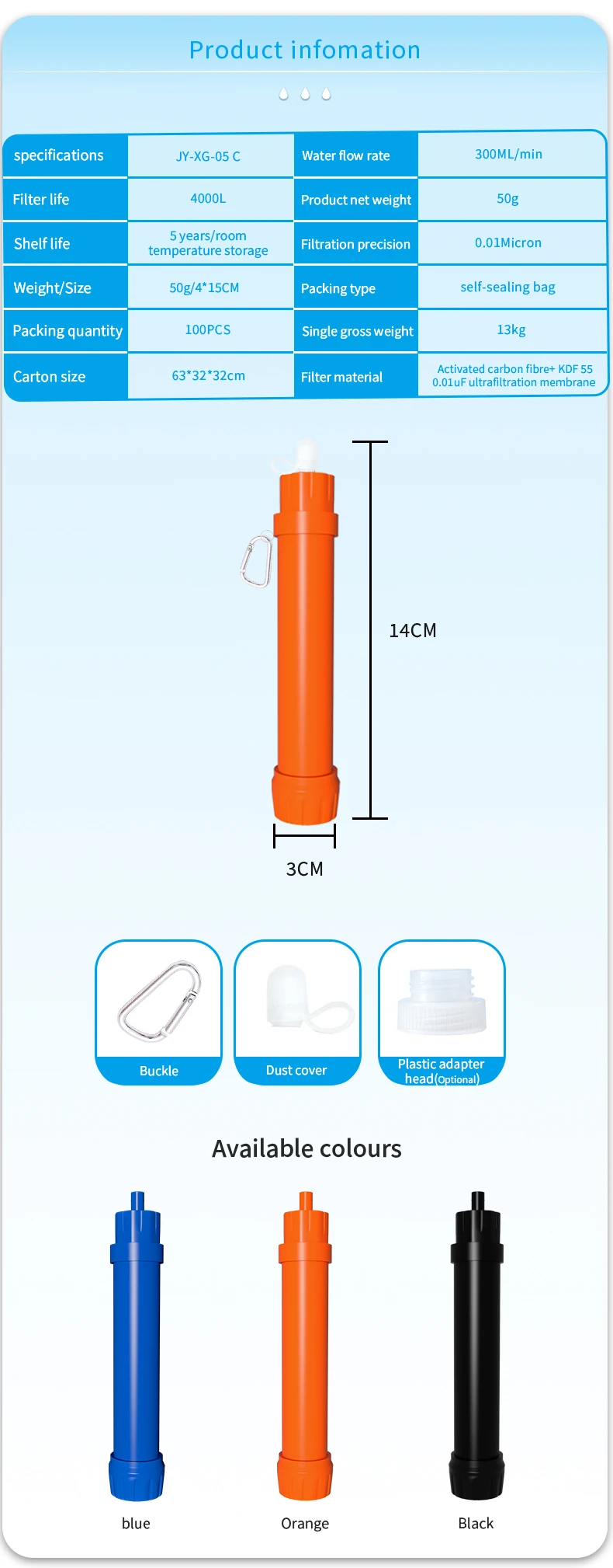 The water filter straw is an innovative and portable device designed to provide clean and safe drinking water in outdoor water source. Compact and Lightweight: The water filter straw is small and lightweight, making it highly portable and easy to carry in your backpack, emergency kit, or even your pocket. Filtration Technology: It uses advanced filtration technology to remove impurities, contaminants from water, ensuring you have access to clean drinking water wherever you are. Easy to Use: Using a water filter straw is straightforward. Simply immerse the straw into the water source (such as a stream, lake, or tap), and then suck through the straw to drink. The filtration process happens as you drink, making it convenient and user-friendly.