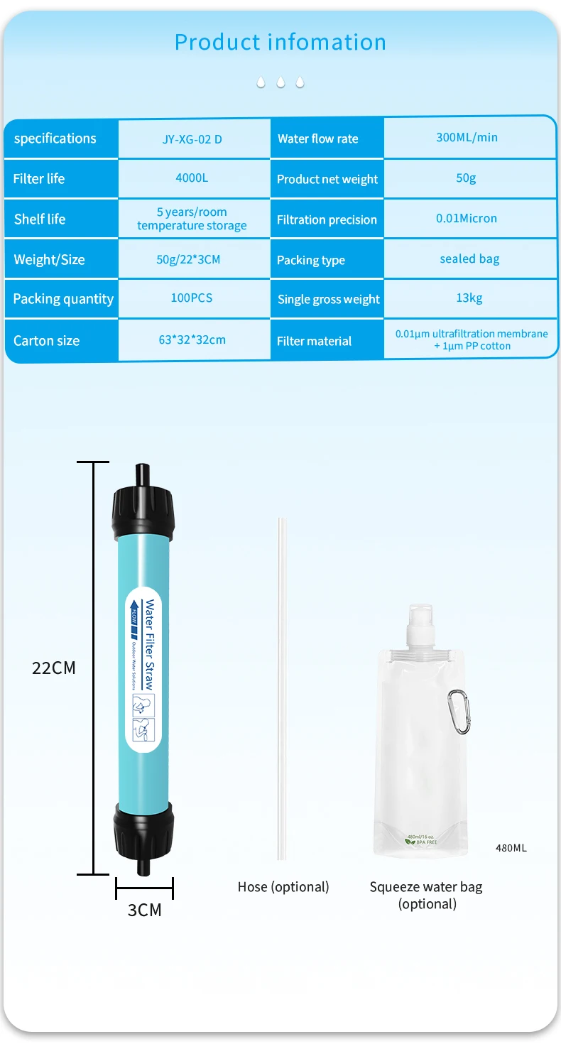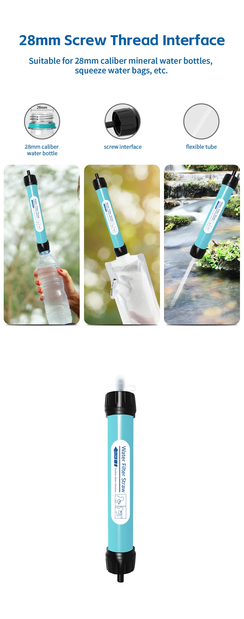 The water filter straw is an innovative and portable device designed to provide clean and safe drinking water in outdoor water source. Compact and Lightweight: The water filter straw is small and lightweight, making it highly portable and easy to carry in your backpack, emergency kit, or even your pocket. Filtration Technology: It uses advanced filtration technology to remove impurities, contaminants, ensuring you have access to clean drinking water wherever you are. Removes Harmful Substances: The water filter straw is capable of removing a wide range of harmful substances, includingprotozoan cysts, microplastics, sediment, and some chemical pollutants. This helps protect you from waterborne diseases and illnesses. Easy to Use: Using a water filter straw is straightforward. Simply immerse the straw into the water source (such as a stream, lake, or tap), and then suck through the straw to drink. The filtration process happens as you drink, making it convenient and user-friendly. Versatility: Water filter straws can be used in various situations, including camping, hiking, backpacking, traveling to areas with uncertain water quality, emergency preparedness, and as a backup option during natural disasters.