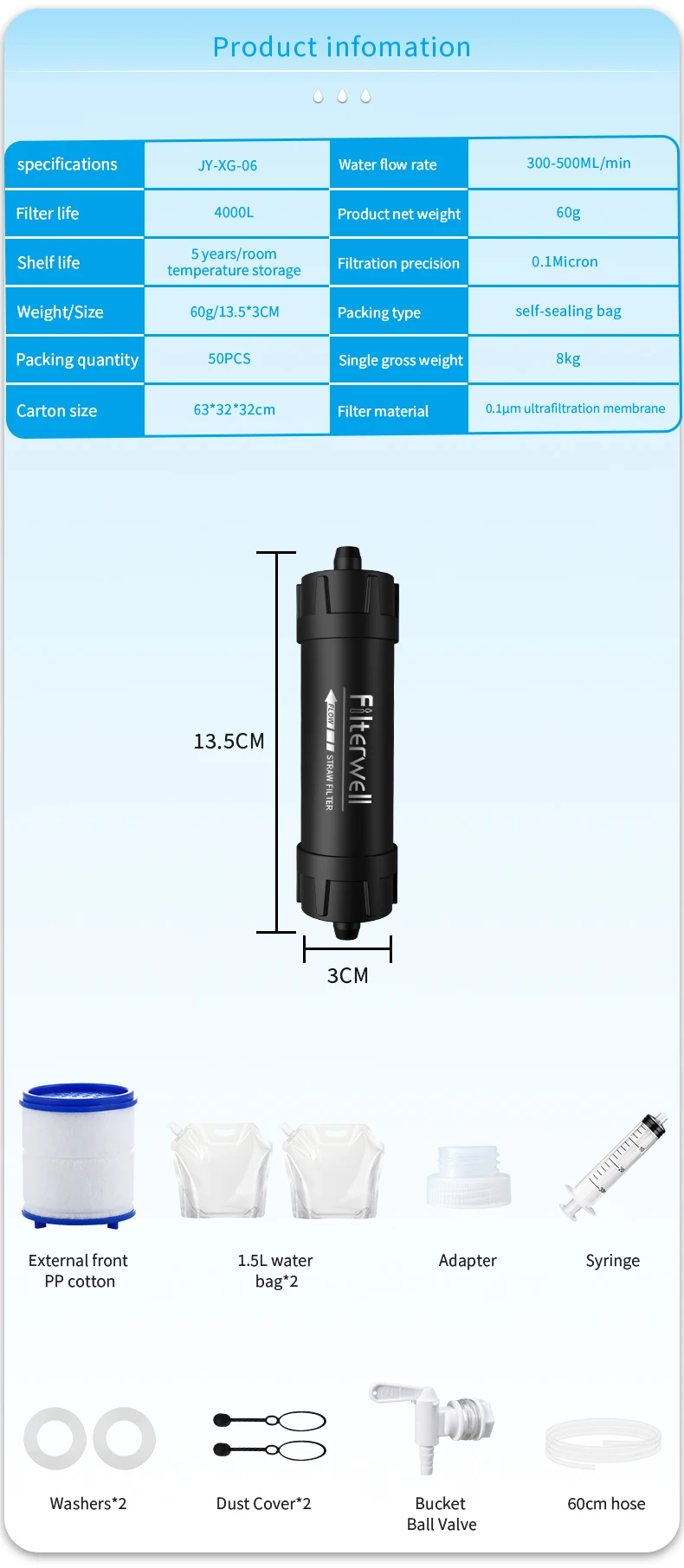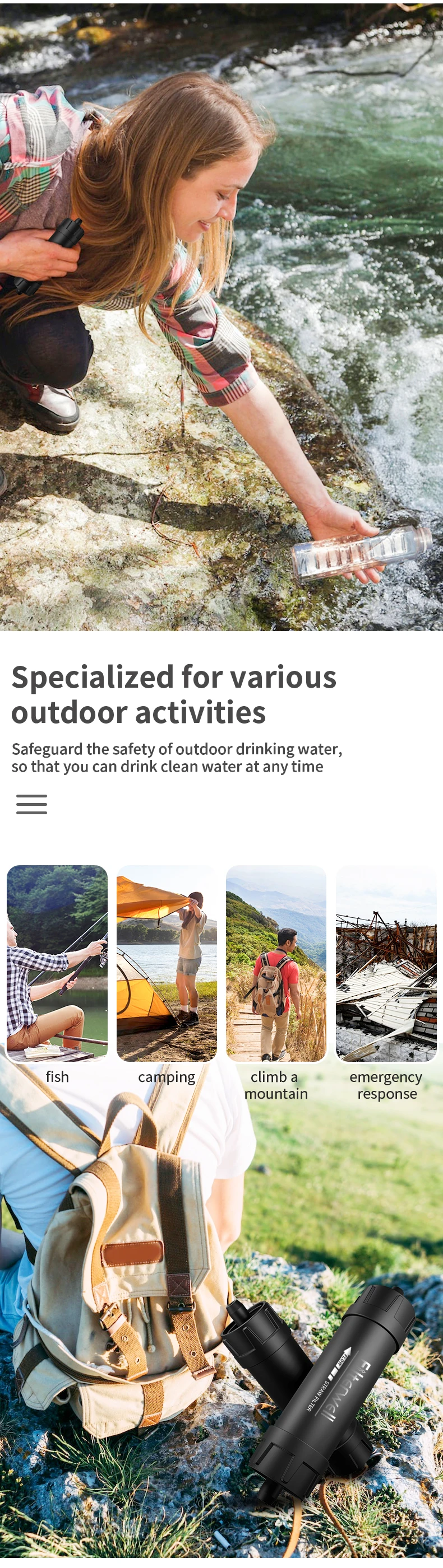 The water filter straw is an innovative and portable device designed to provide clean and safe drinking water in outdoor water source. Compact and Lightweight: The water filter straw is small and lightweight, making it highly portable and easy to carry in your backpack, emergency kit, or even your pocket. Filtration Technology: It uses advanced filtration technology to remove impurities, contaminants, ensuring you have access to clean drinking water wherever you are. Removes Harmful Substances: The water filter straw is capable of removing a wide range of harmful substances, includingprotozoan cysts, microplastics, sediment, and some chemical pollutants. This helps protect you from waterborne diseases and illnesses. Easy to Use: Using a water filter straw is straightforward. Simply immerse the straw into the water source (such as a stream, lake, or tap), and then suck through the straw to drink. The filtration process happens as you drink, making it convenient and user-friendly. Versatility: Water filter straws can be used in various situations, including camping, hiking, backpacking, traveling to areas with uncertain water quality, emergency preparedness, and as a backup option during natu