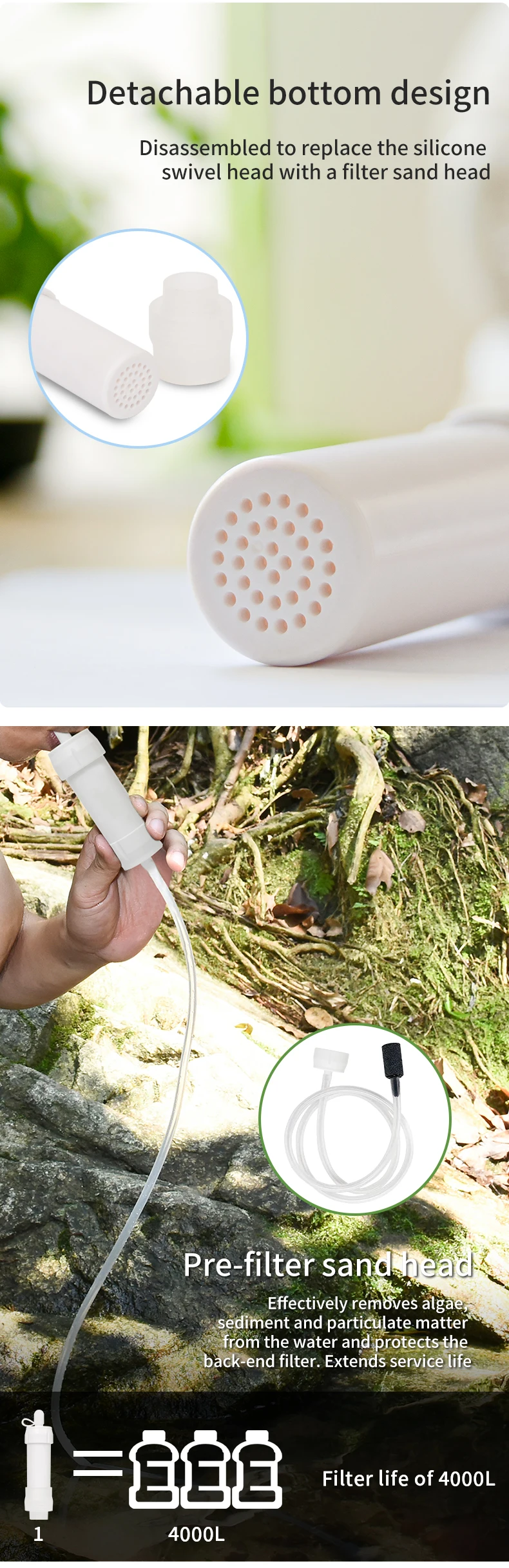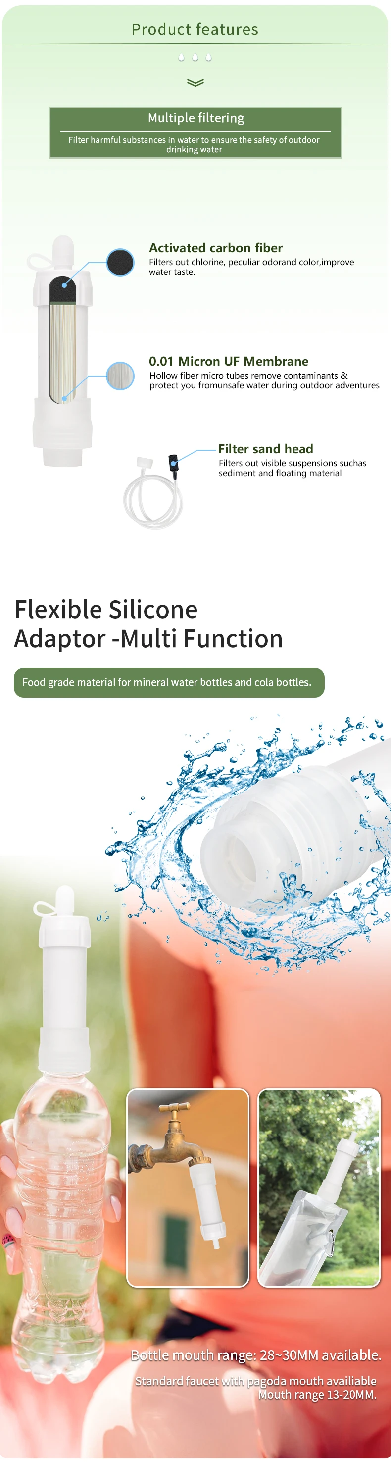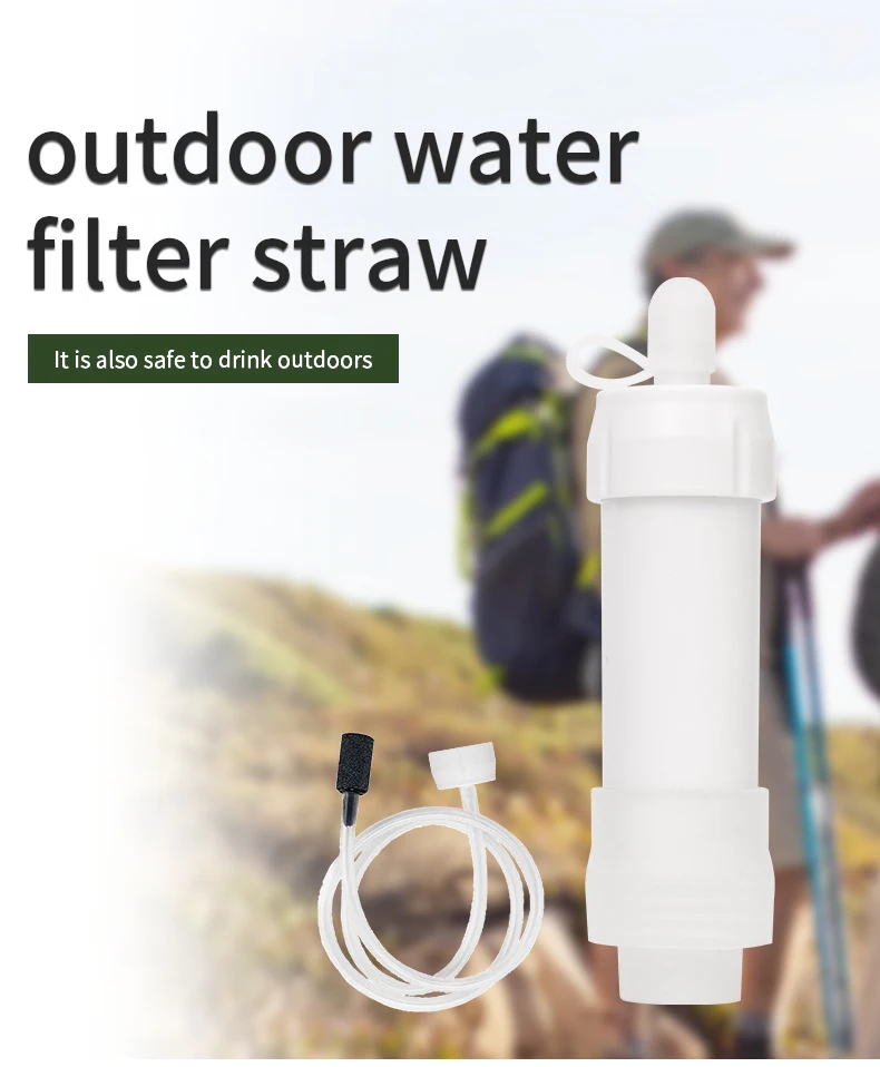water filter straw. This portable and light weight water straw is ideal for backpacking, hiking, camping, scouting,back country travel, mission trip and emergency preparedness. Hollow fiber UF membrane carbon fiber combination .can remove 99.9999% such as salmonella, cholera, E.coli, and protozoa, such as giardia, cryptosporidium, and sediment, odor, color, chlorine, organic matter and heavy metal.
