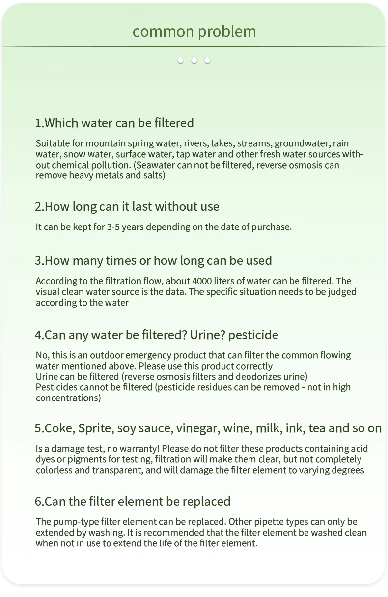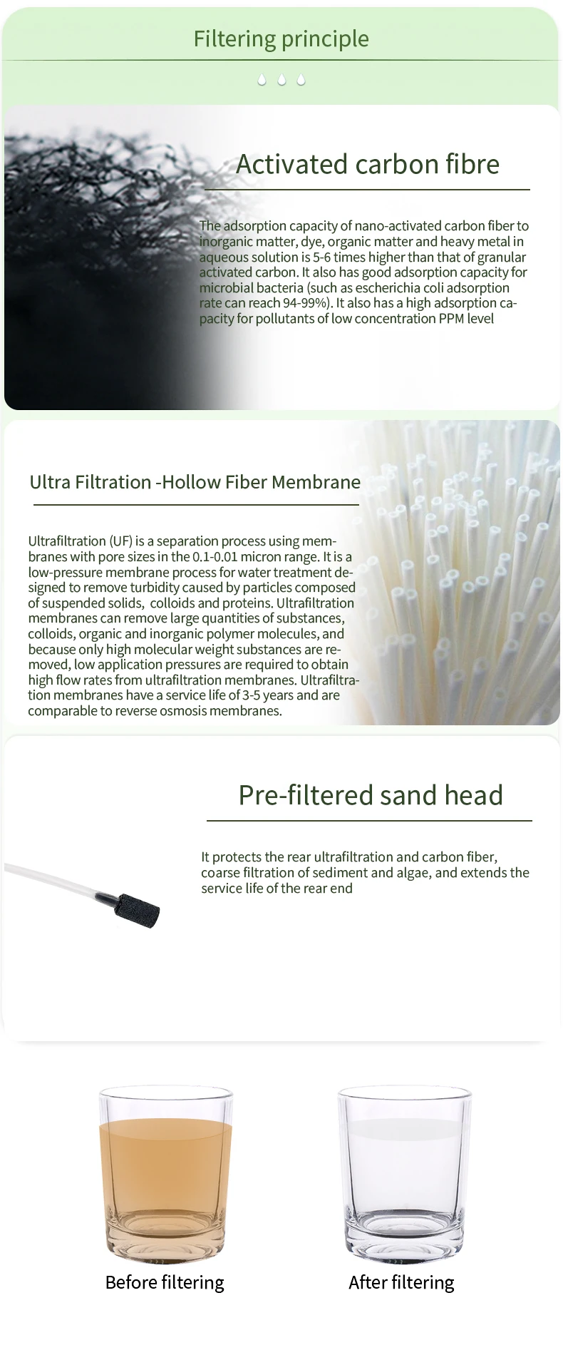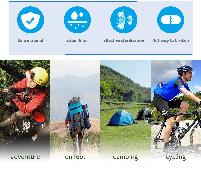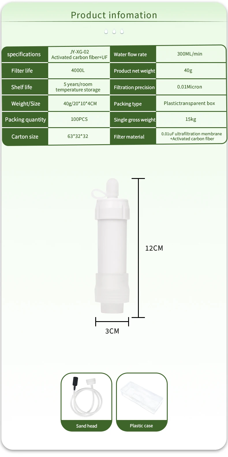 water filter straw. This portable and light weight water straw is ideal for backpacking, hiking, camping, scouting,back country travel, mission trip and emergency preparedness. Hollow fiber UF membrane carbon fiber combination .can remove 99.9999% such as salmonella, cholera, E.coli, and protozoa, such as giardia, cryptosporidium, and sediment, odor, color, chlorine, organic matter and heavy metal.