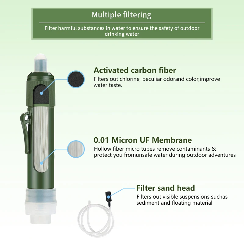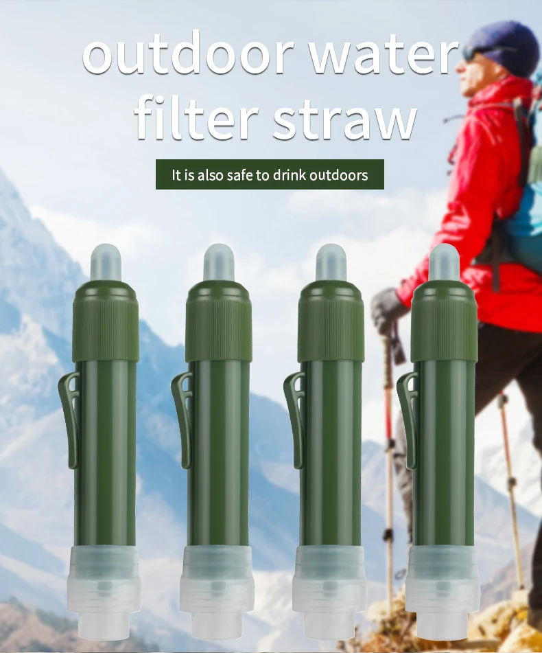 The water filter straw is an innovative and portable device designed to provide clean and safe drinking water in outdoor water source. Compact and Lightweight: The water filter straw is small and lightweight, making it highly portable and easy to carry in your backpack, emergency kit, or even your pocket. Filtration Technology: It uses advanced filtration technology to remove impurities, contaminants from water, ensuring you have access to clean drinking water wherever you are. Easy to Use: Using a water filter straw is straightforward. Simply immerse the straw into the water source (such as a stream, lake, or tap), and then suck through the straw to drink. The filtration process happens as you drink, making it convenient and user-friendly.