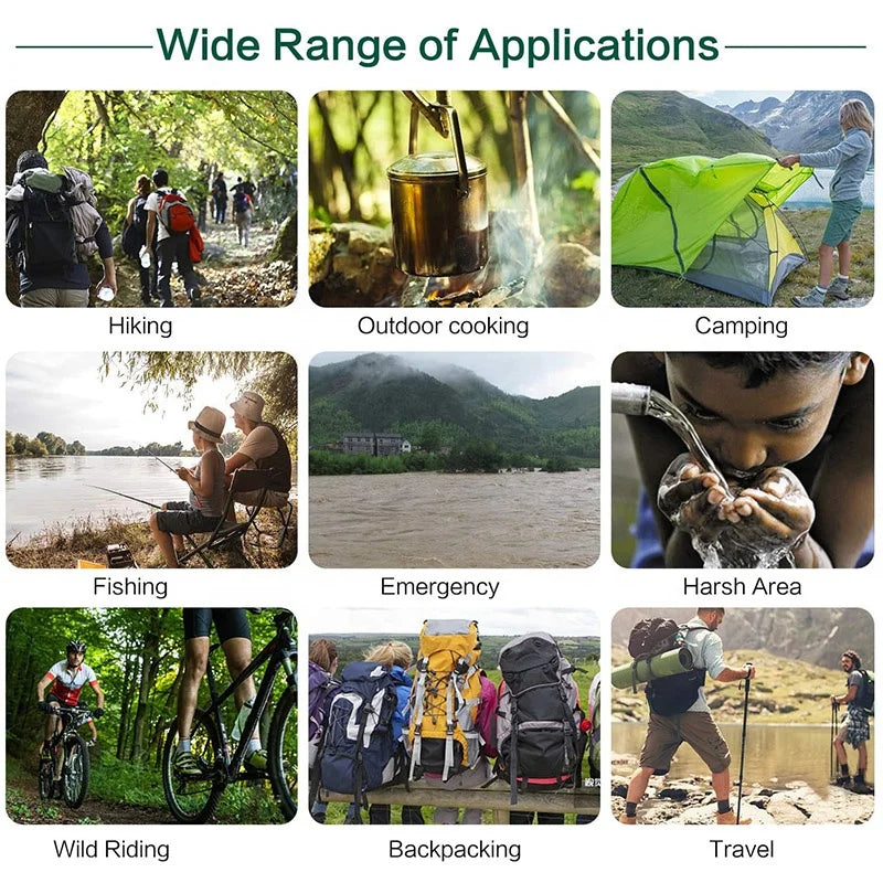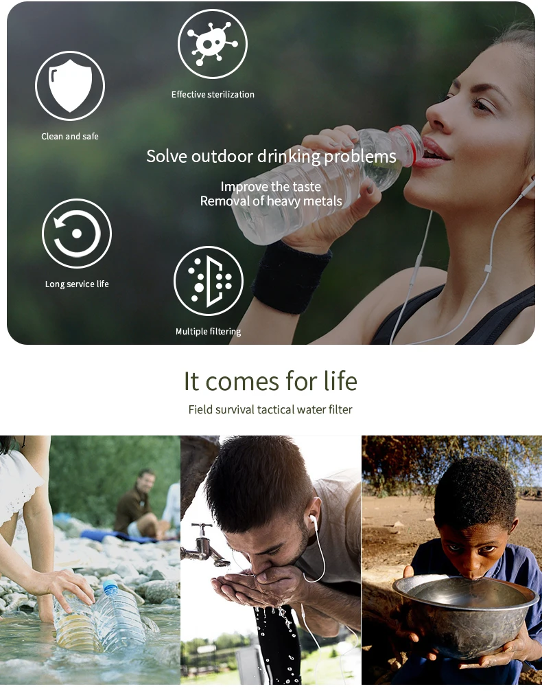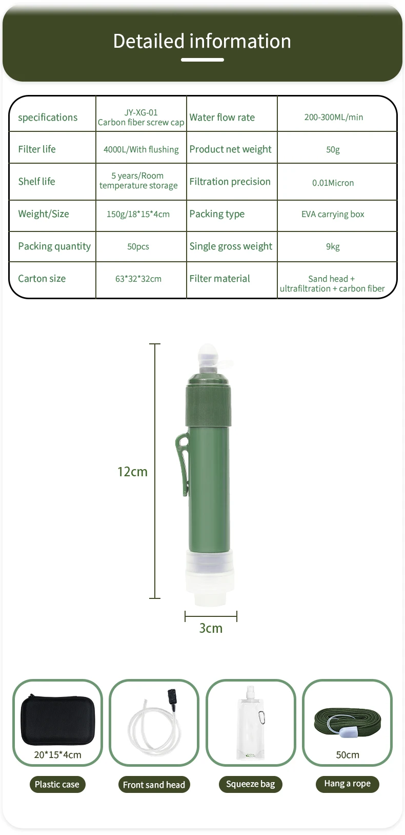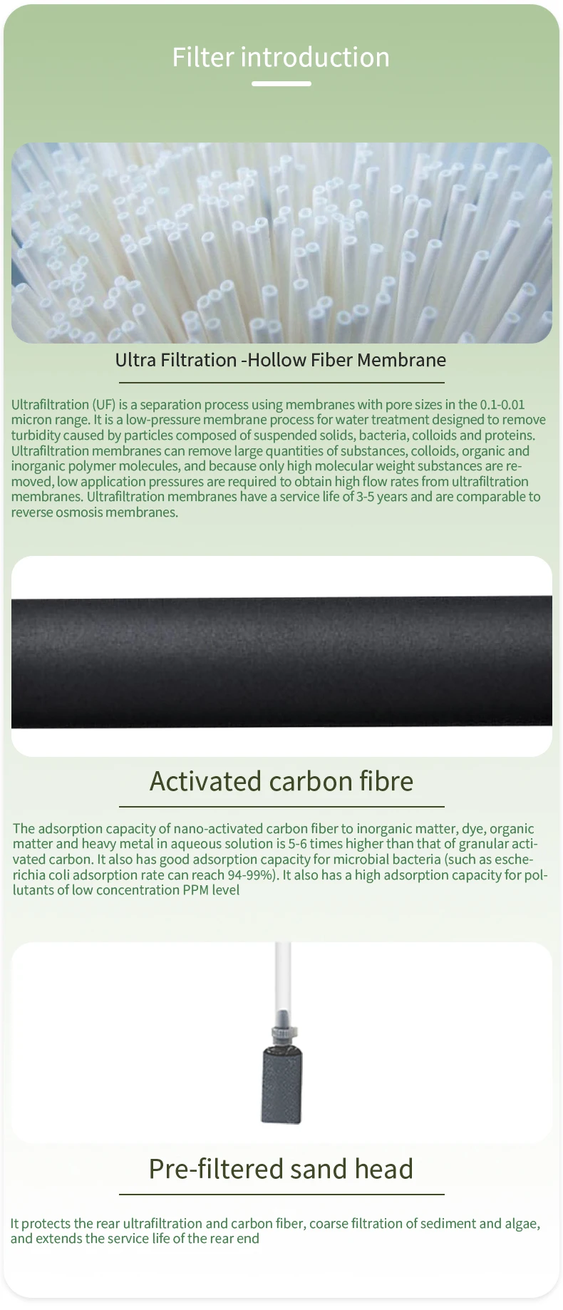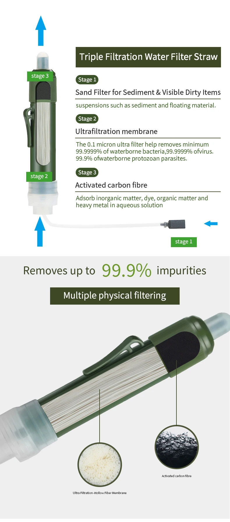back country travel, mission trip and emergency preparedness. Hollow fiber UF membrane carbon fiber combination .can remove 99.9999%, such as salmonella, cholera, E.coli, and protozoa, such as giardia, cryptosporidium, and sediment, odor, color, chlorine, organic matter and heavy metal.