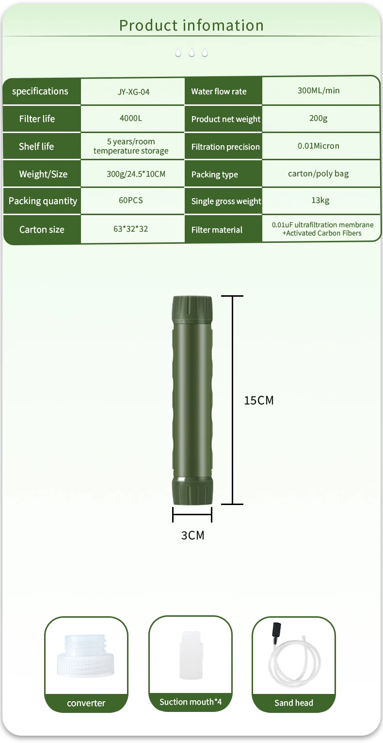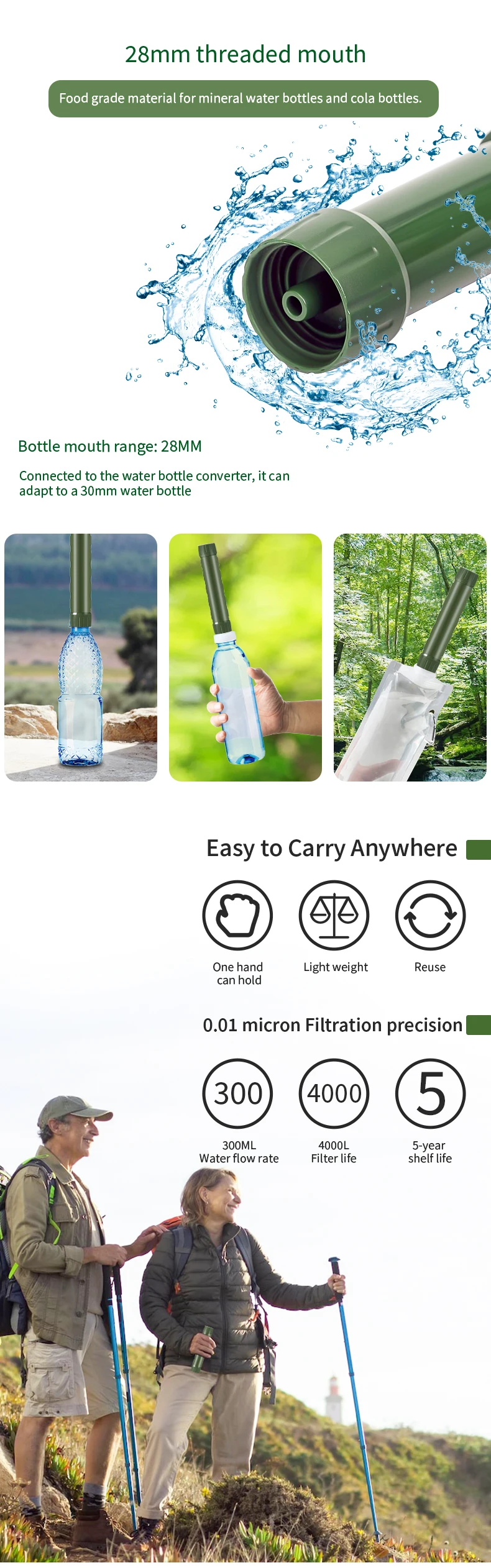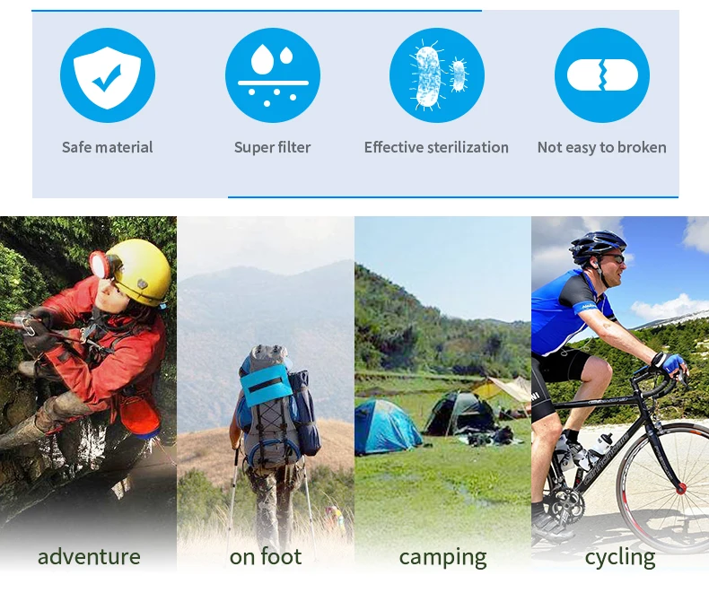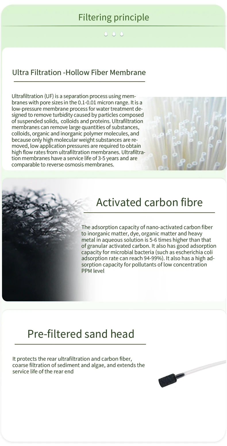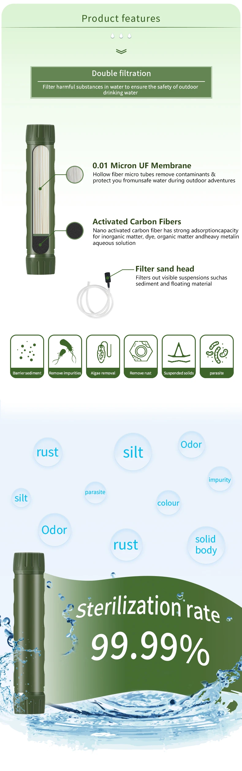 back country travel, mission trip and emergency preparedness. Hollow fiber UF membrane carbon fiber combination .can remove 99.9999%, such as salmonella, cholera, E.coli, and protozoa, such as giardia, cryptosporidium, and sediment, odor, color, chlorine, organic matter and heavy metal.