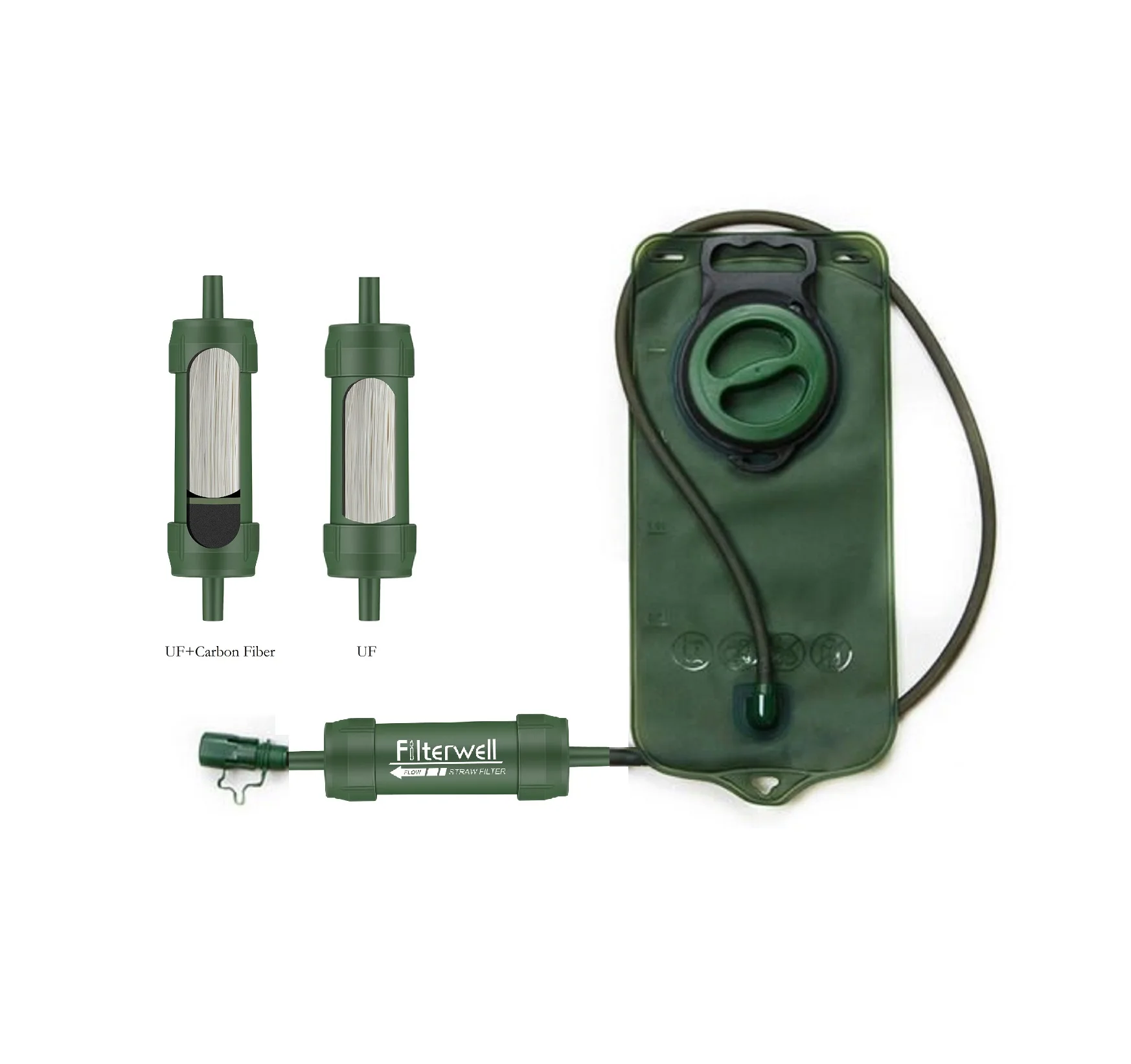 This portable and light weight water straw hydration flask bag bladder . is ideal for backpacking, hiking, camping, scouting,back country travel, mission trip and emergency preparedness. Hollow fiber UF membrane carbon fiber combination .can remove 99.9999%, such as salmonella, cholera, E.coli, and protozoa, such as giardia, cryptosporidium, and sediment, odor, color, chlorine, organic matter and heavy metal.
