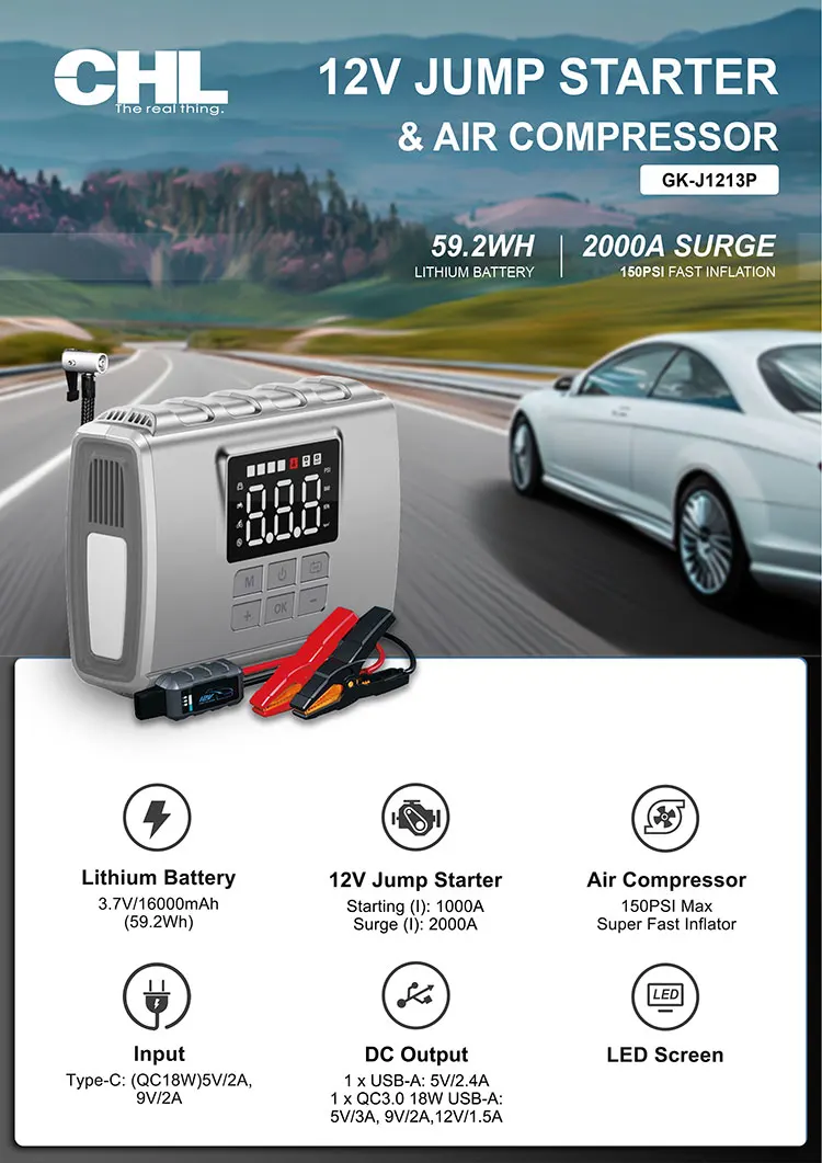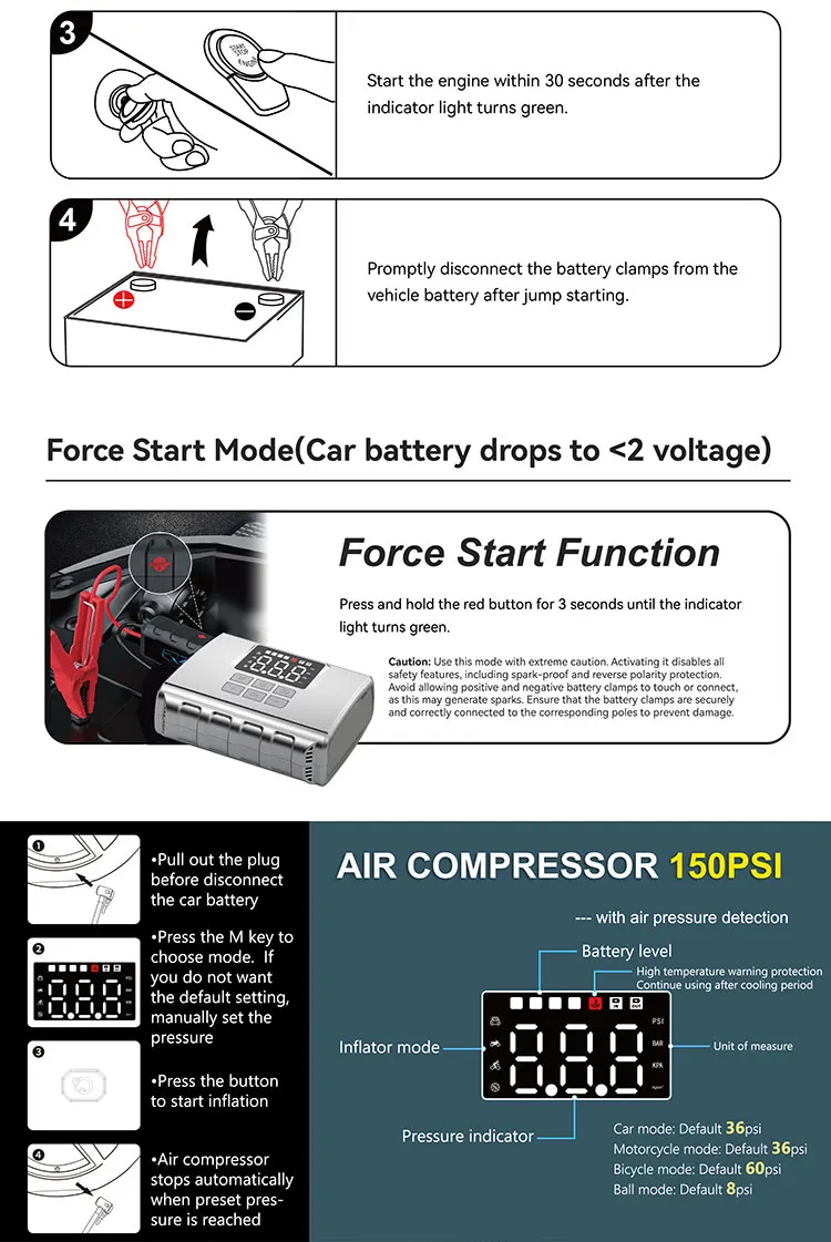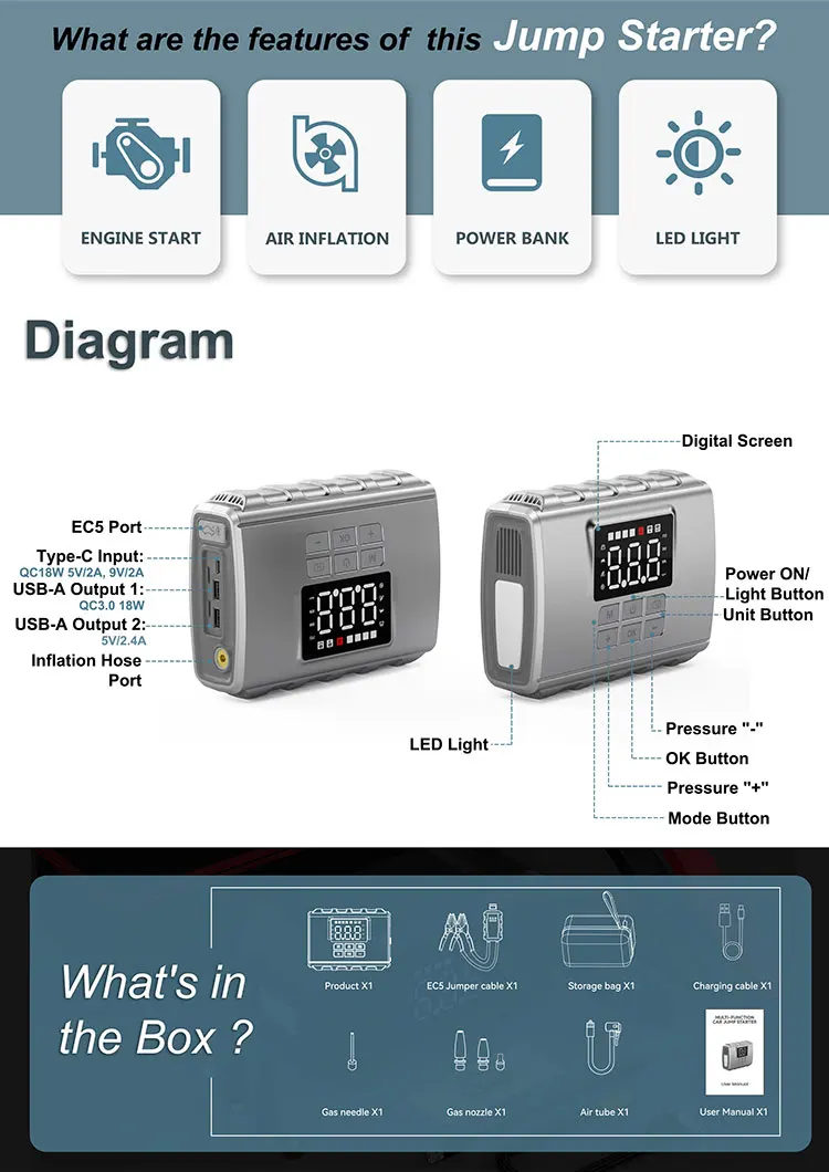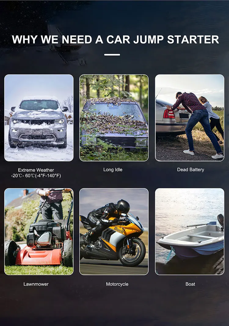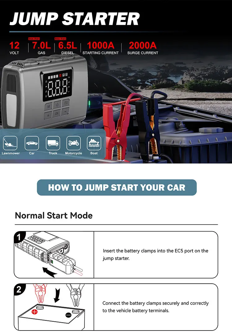 Q:Do you have any other product lineup? A:So far we have 12V jump starter,12V jump starter+air compressor and 24V jump starter.