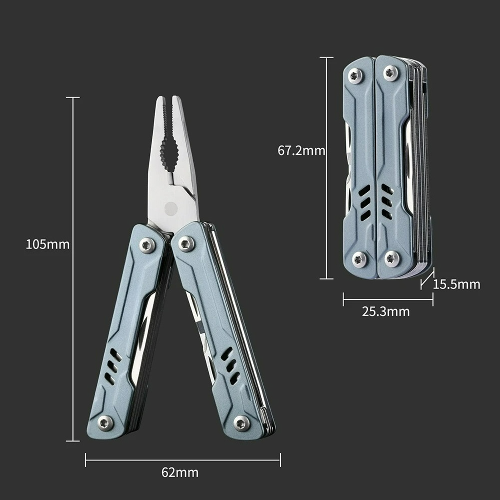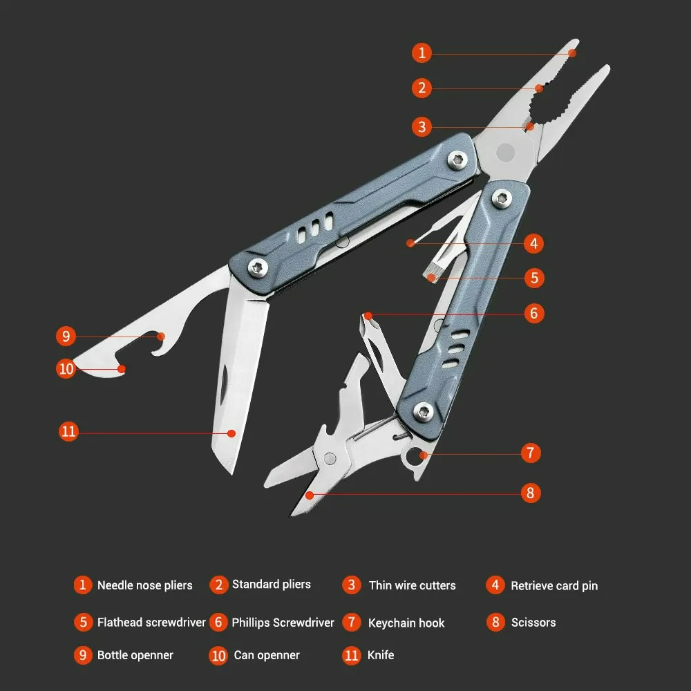 Function:Mini Pliers, Standard pliers, Think-wire Cutters, Retrieve Card Pin, Flathead Screwdriver, Phillips Screwdriver, Keychain Hook, Scissors, Bottle Opener, Can Opener, Multi Tool Knife