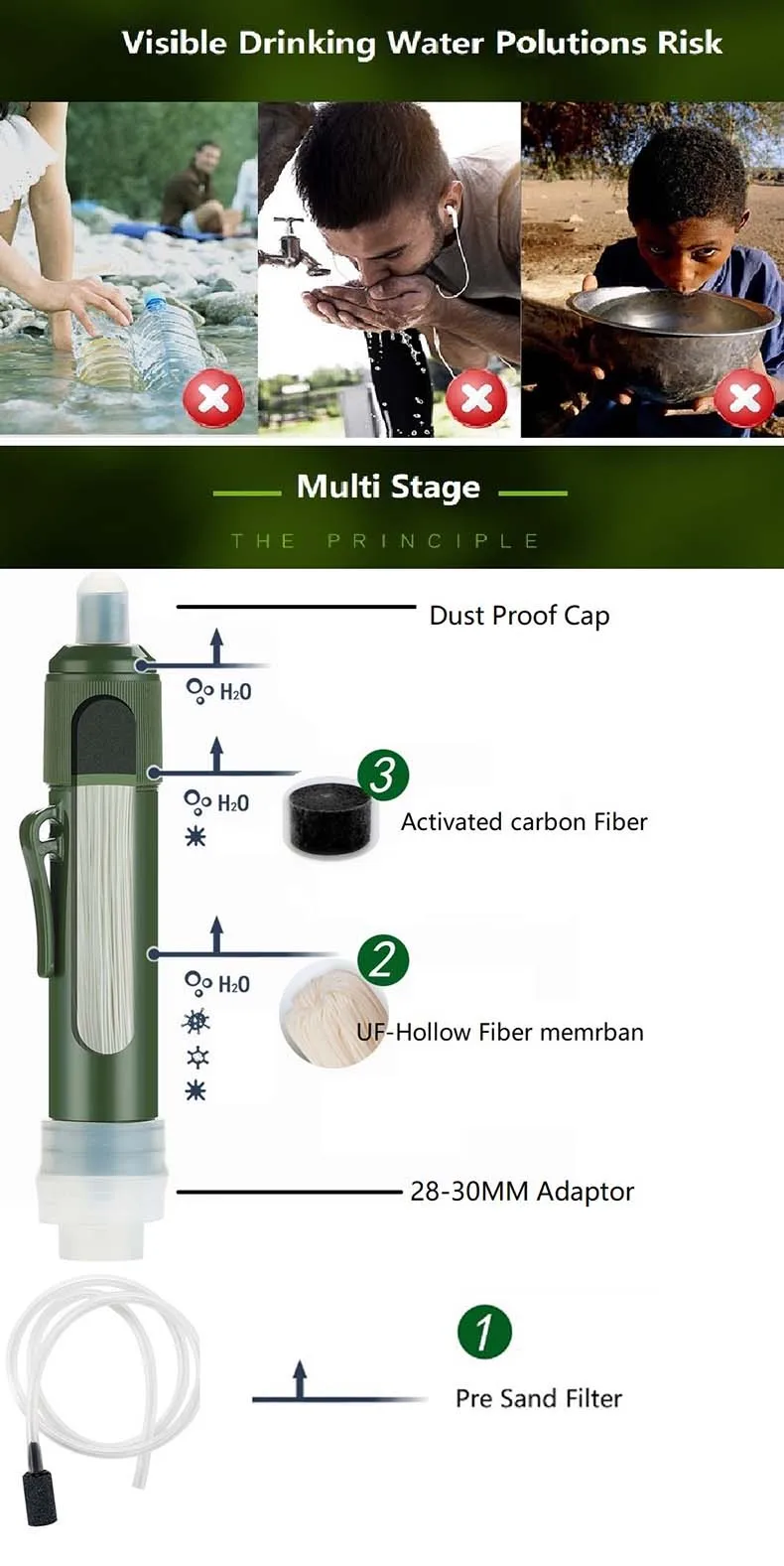 back country travel, mission trip and emergency preparedness. Hollow fiber UF membrane carbon fiber KDF CUZN 55 Filter media combination .can remove 99.9999%, such as salmonella, cholera, E.coli, and protozoa, such as giardia, cryptosporidium, and sediment, odor, color, chlorine, organic matter and heavy metal.