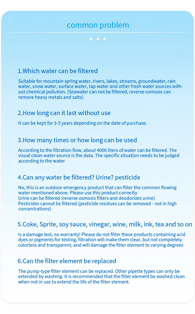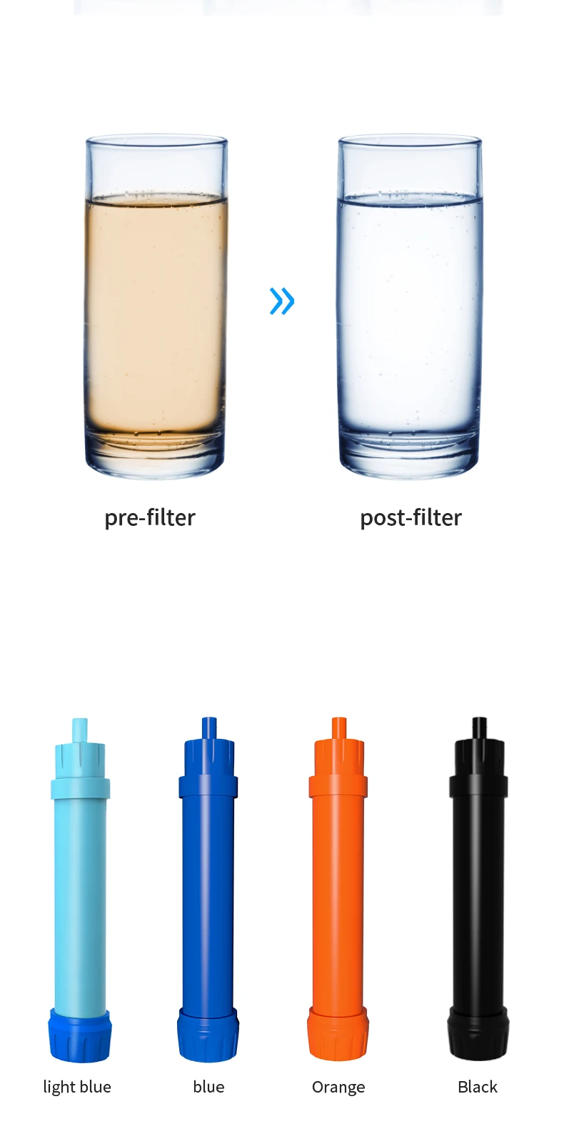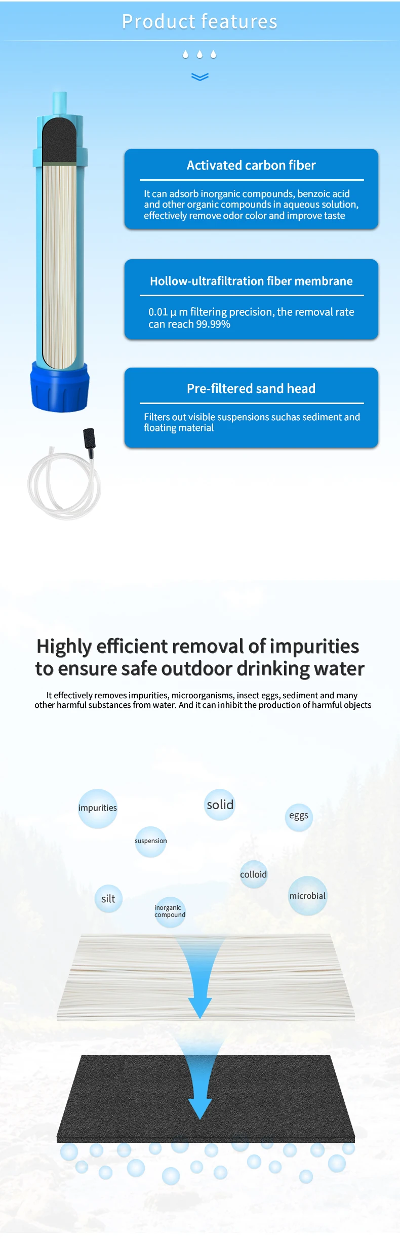 back country travel, mission trip and emergency preparedness. Hollow fiber UF membrane carbon fiber combination .can remove 99.9999% such as salmonella, cholera, E.coli, and protozoa, such as giardia, cryptosporidium, and sediment, odor, color, chlorine, organic matter and heavy metal.