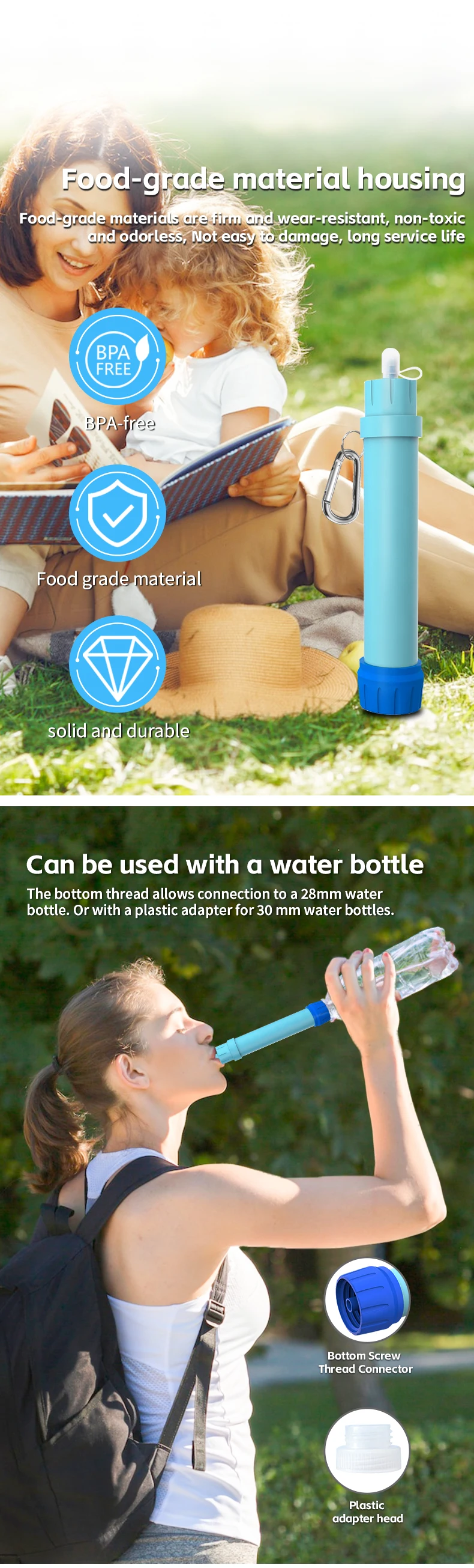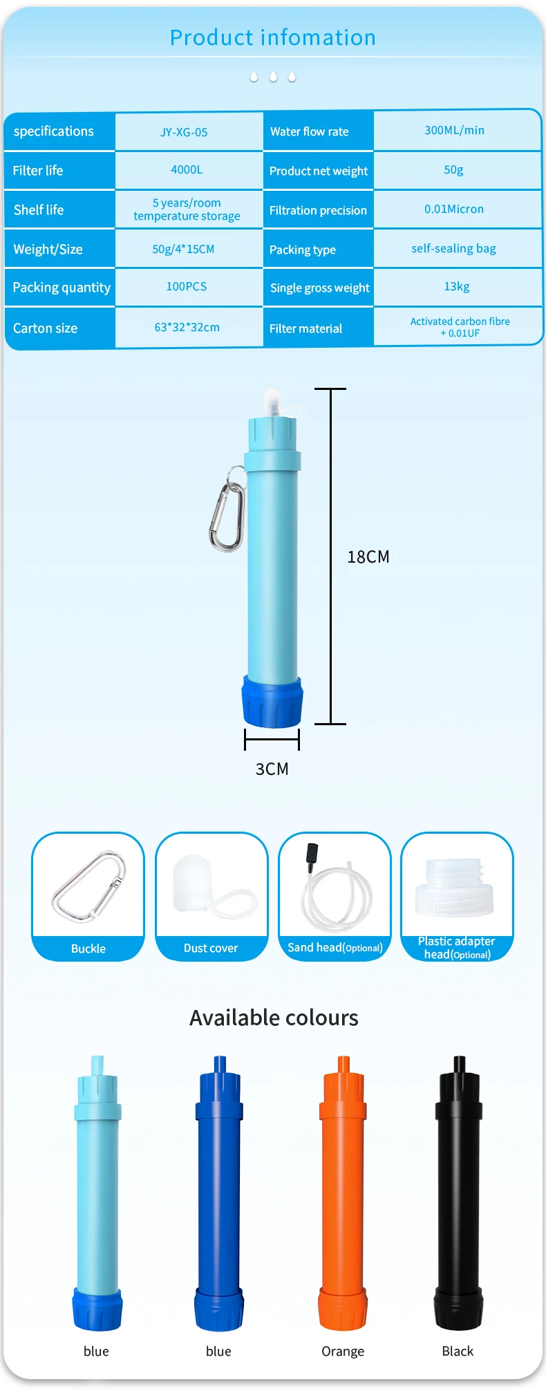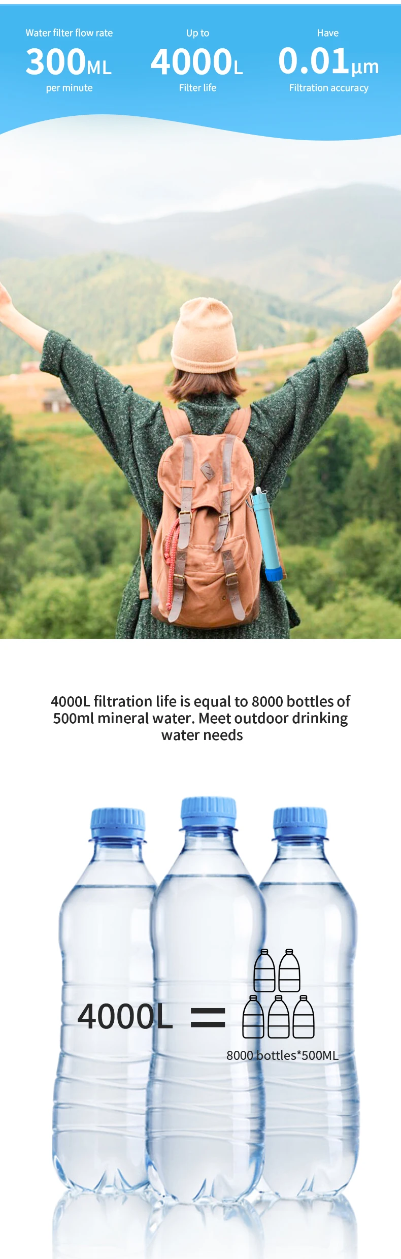 back country travel, mission trip and emergency preparedness. Hollow fiber UF membrane carbon fiber combination .can remove 99.9999% such as salmonella, cholera, E.coli, and protozoa, such as giardia, cryptosporidium, and sediment, odor, color, chlorine, organic matter and heavy metal.
