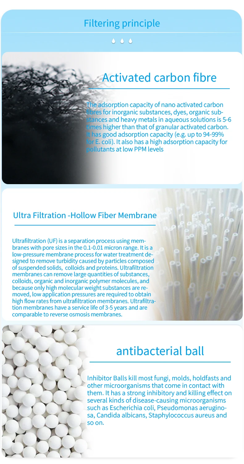 Activated carbon fiber lt can adsorb inorganic compounds, benzoic acidand other organic compounds in aqueous solutioneffectively remove odor color and improve taste Hollow-ultrafiltration fiber membrane 0.01 u m filtering precision, the removal ratecan reach 99.99% Pre-filtered sand head Filters out visible suspensions suchas sediment andfloating material