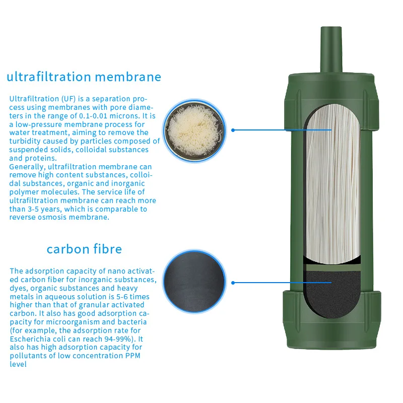 This portable and light weight water straw hydration flask bag bladder . is ideal for backpacking, hiking, camping, scouting,back country travel, mission trip and emergency preparedness. Hollow fiber UF membrane and anti-bacterial carbon fiber combination .can remove 99.9999% of bacteria, such as salmonella, cholera, E.coli, and protozoa, such as giardia, cryptosporidium, and sediment, odor, color, chlorine, organic matter and heavy metal.